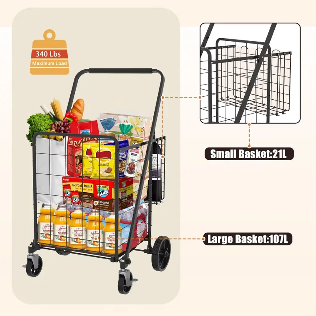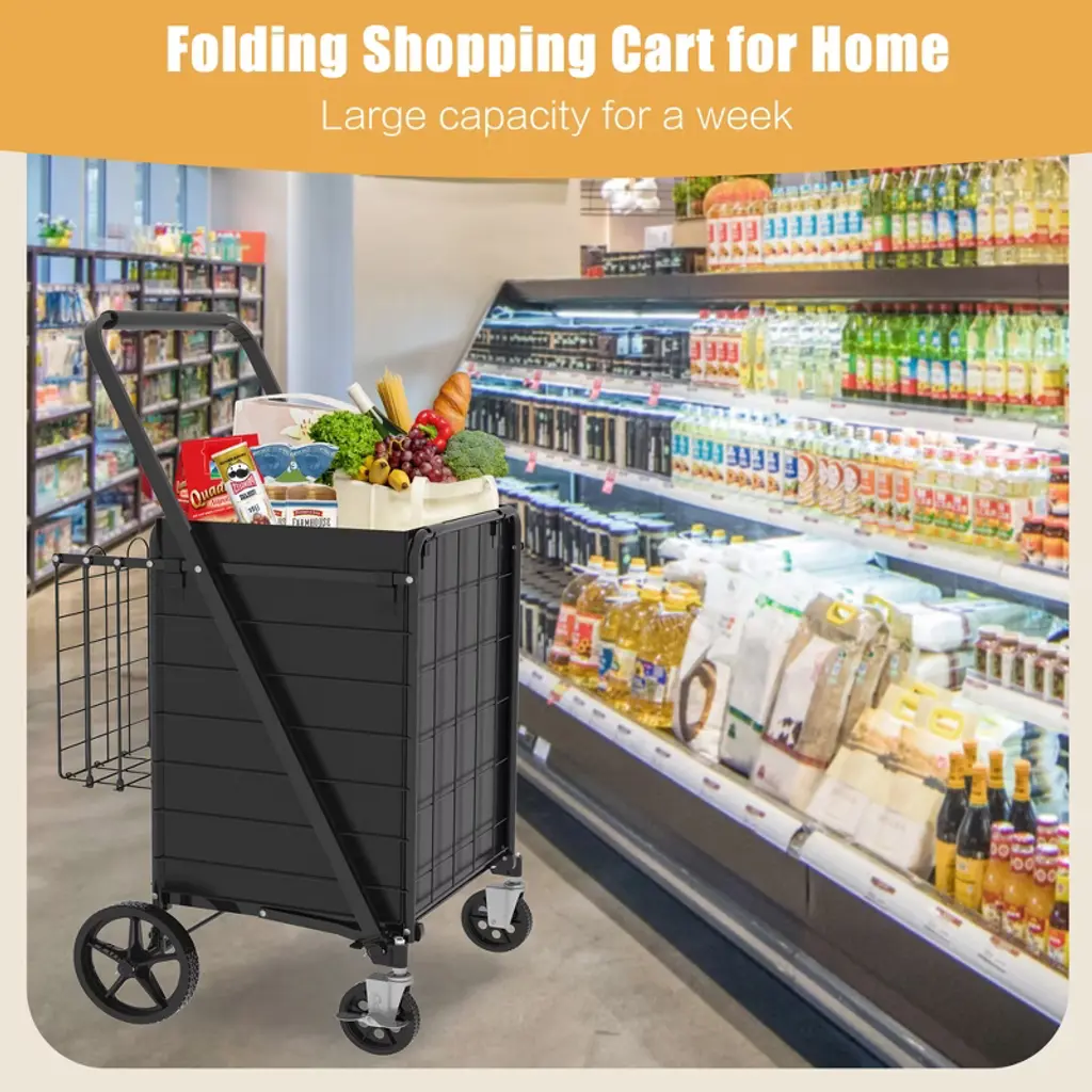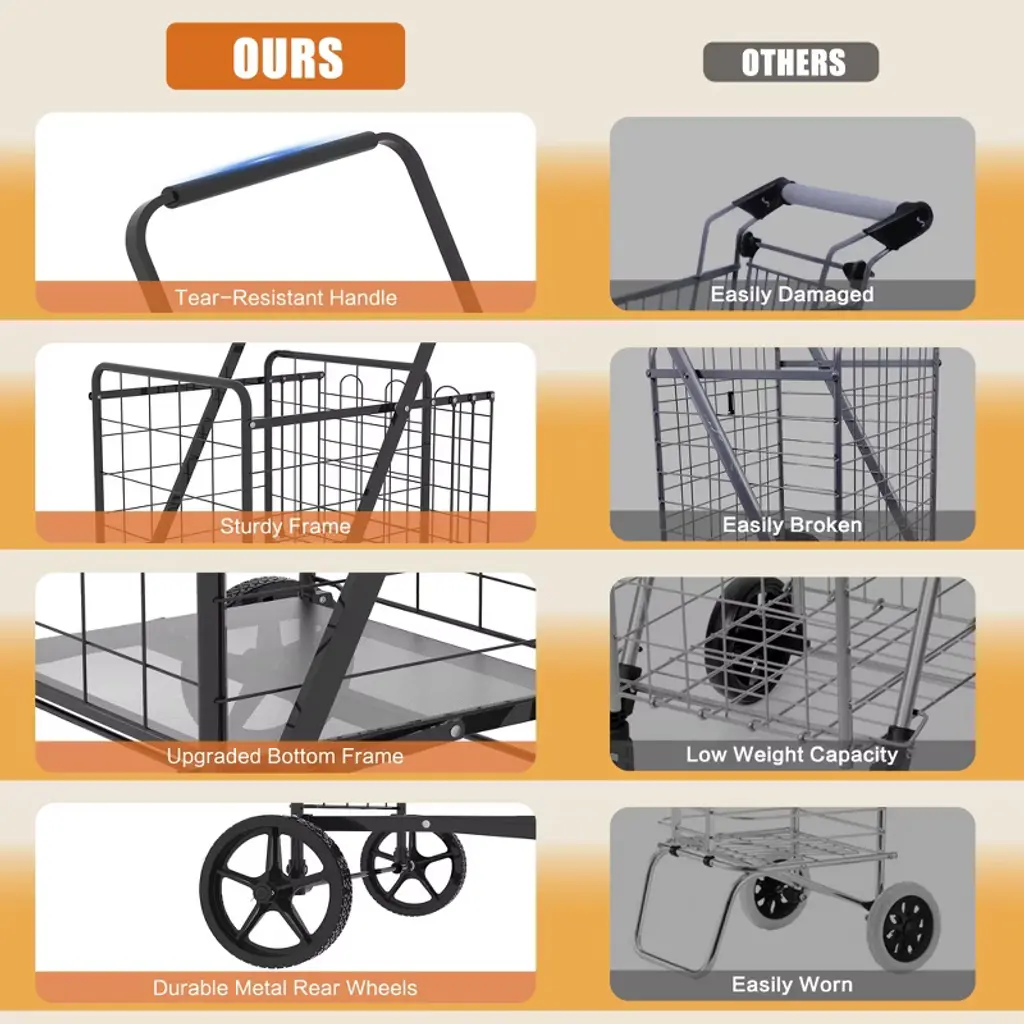 Our foldable shopping cart made by high quality low-carbon stainless steel,the wider steel and stable fame structure makes you can easily carry 150kg. You can get all your groceries to apartment in one trip via this large size shopping cart.