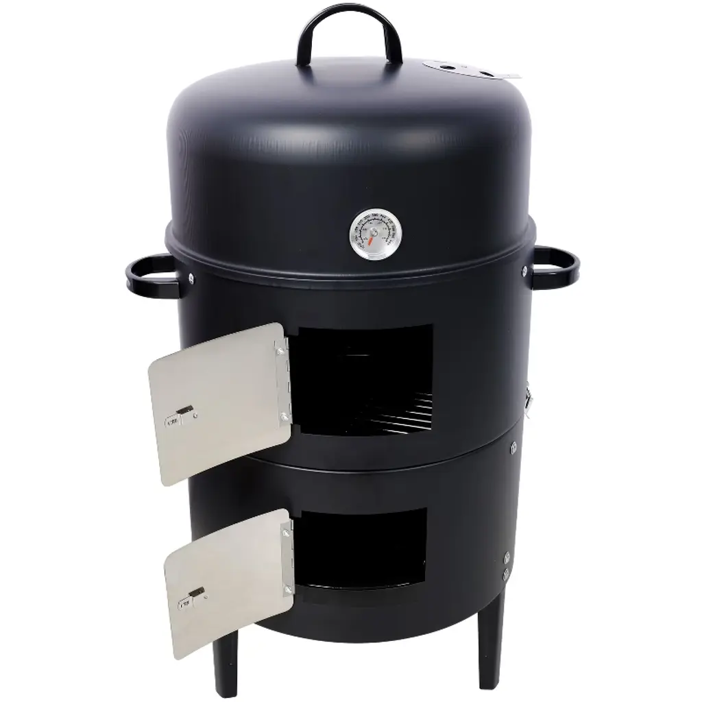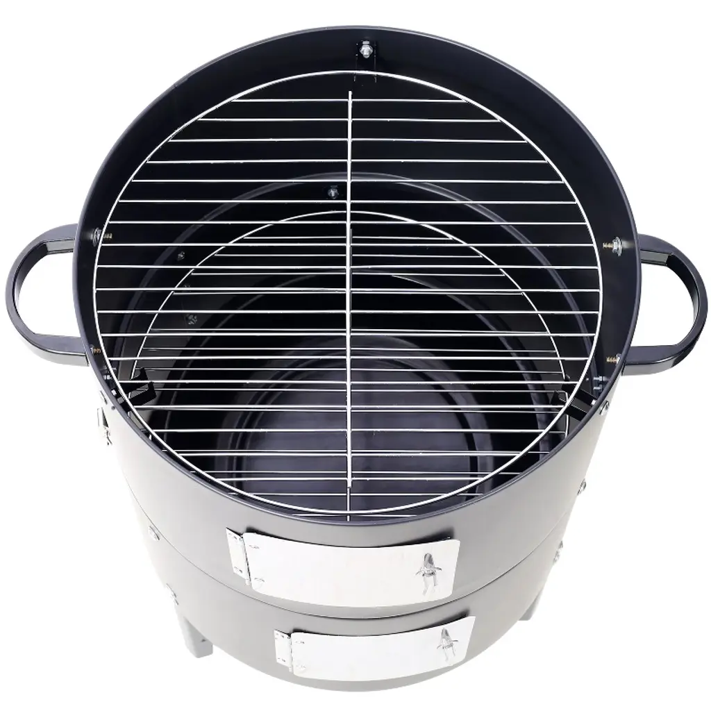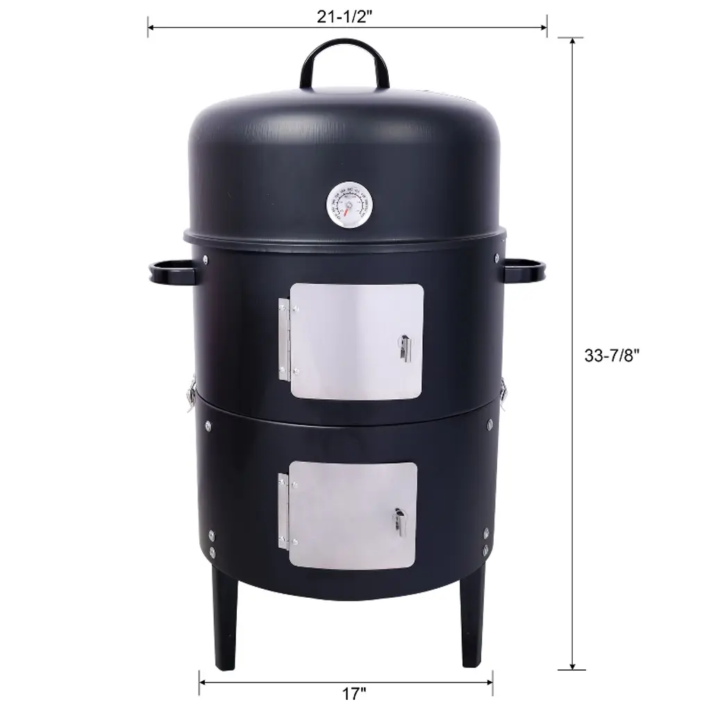 Bring your outdoor cooking to the next level with this 17-inch steel charcoal smoker, designed for both flavor and function. With a total of 453 square inches of cooking space and dual porcelain-enameled water and charcoal pans, this versatile smoker is perfect for grilling, smoking, baking, braising, and more. It features a built-in thermometer with a detailed scale, adjustable air vents, and heat-resistant Bakelite handles for safe, precise heat control. The stable two-layer design and latch locking system allow for easy transport and cleanup, while two independent access doors let you add charcoal or check food without losing heat. Constructed from 0.5mm thick steel with a high-temperature painted finish, this smoker offers durability, safety, and excellent heat retention for backyard BBQs, campouts, or weekend feasts.