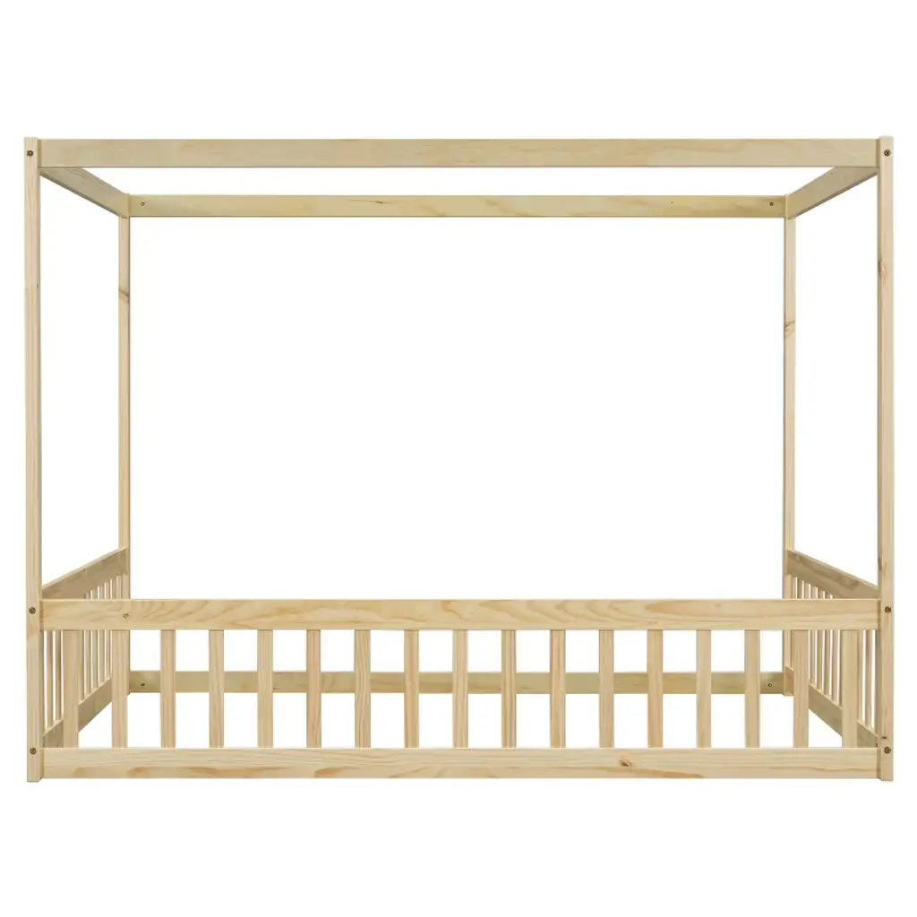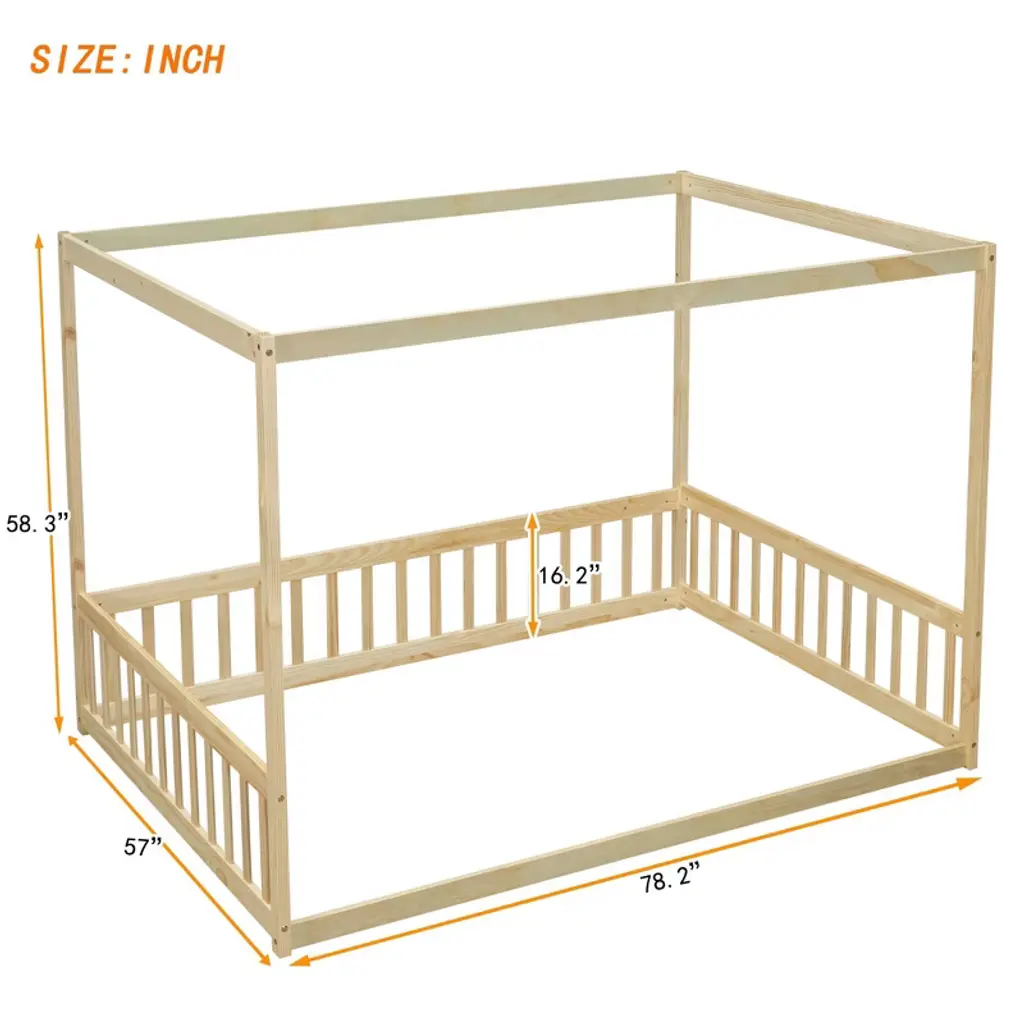 Create a magical sleep space with this charming full bed frame, featuring a wooden canopy structure and protective guardrails for safety. Measuring 78.2"L x 57"W x 58.3"H, this full size bed frame is crafted from premium pine wood in a low-profile floor design perfect for young dreamers. The bed frame full includes sturdy guardrails on three sides with one open side for easy access, supporting up to 250lbs. Weighing just 43 lbs, this full bedframe assembles easily to create a cozy, imaginative sleeping nook that can be decorated with curtains or lights. The minimalist design blends functionality with whimsy for a perfect first "big kid" bed.