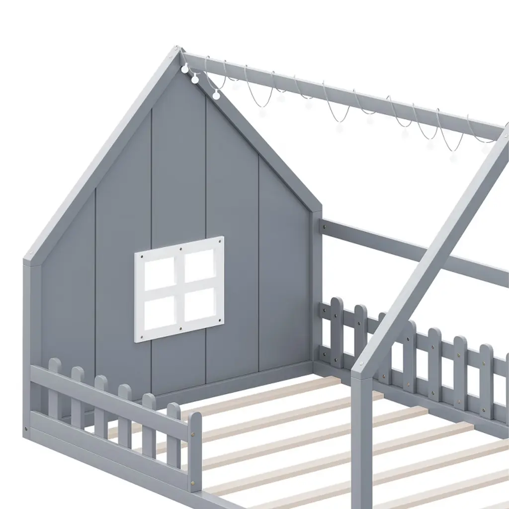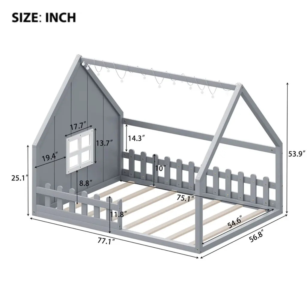 Transform your child's bedroom with this charming full bed frame designed as a cozy house, complete with windows and safety railings. Measuring 77.1"L x 56.8"W x 53.9"H, this full size bed frame is crafted from durable pine wood and MDF with a 400lb weight capacity. The bed frame full features playful house-shaped framing that sparks imagination while the included LED light strip creates magical ambiance. With 53.9" height and protective railings, this full bedframe provides a safe play and sleep space without needing a box spring. Weighing just 73 lbs, this rustic-inspired bed frame full size assembles easily to create a delightful bedroom centerpiece.