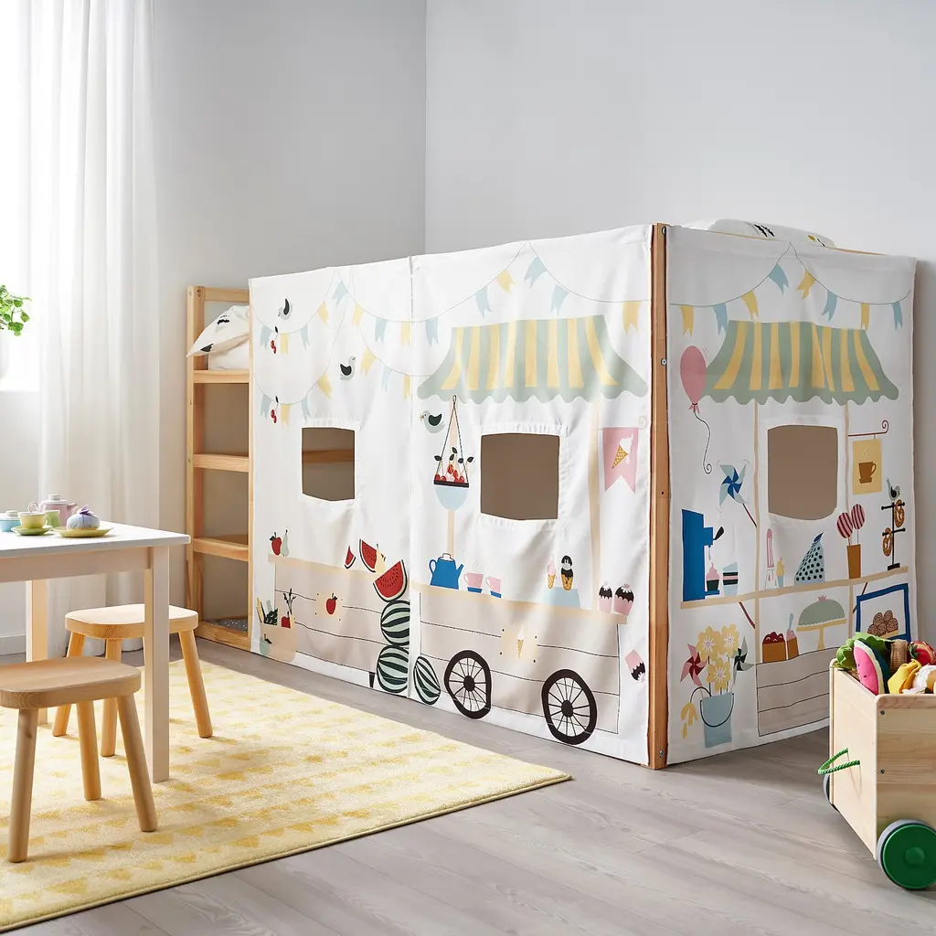 KURA Bed curtain - market stall pattern. The curtain can be used regardless of how you turn the bed and where you position the ladder. Each market stall has an opening, so the children can play both on the inside and outside and take turns being a salesperson or customer. Fits KURA reversible bed.