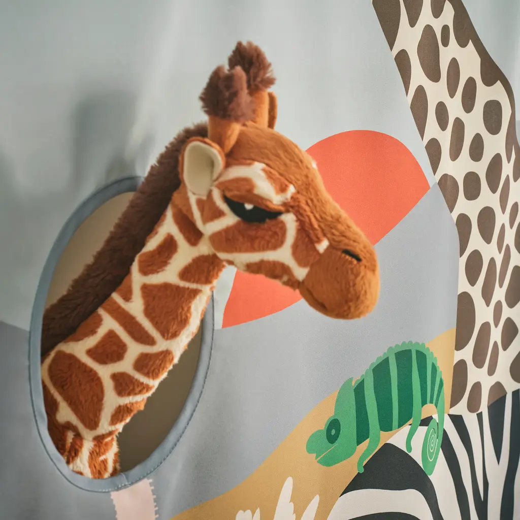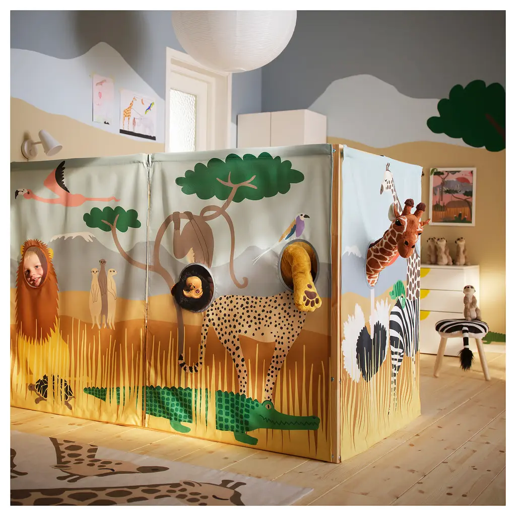 KURA Bed curtain - multicolor/animals on the savannah. Imagination and creativity are stimulated when you transform into a lion, monkey, ostrich or cheetah by placing your face against one of the holes. The curtain can be used regardless of how you turn the bed and where you position the ladder.
