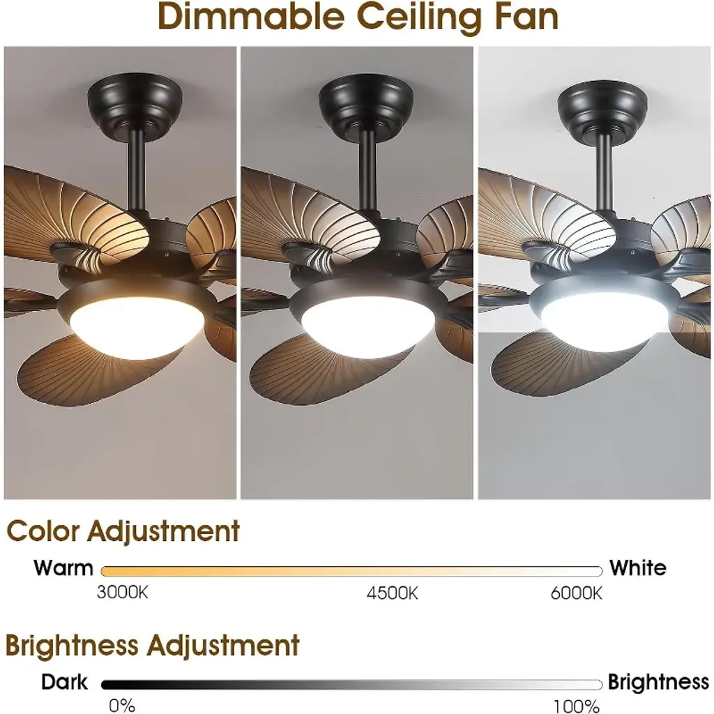 Kviflon 44 Inch Tropical Ceiling Fan With Led Lights, Palm Leaf Blades,6 Speed,dimmable Led,wood Grain Design,for Kitchen,dining Room,patio