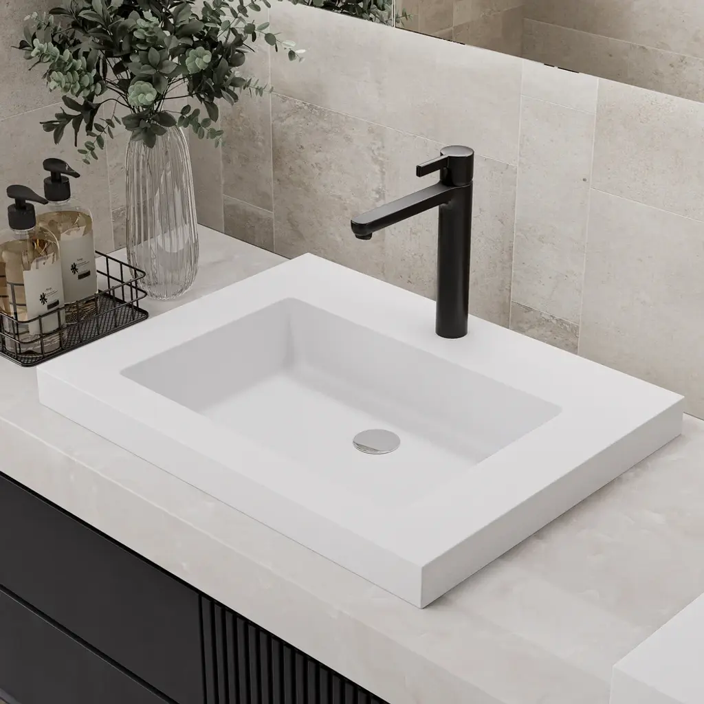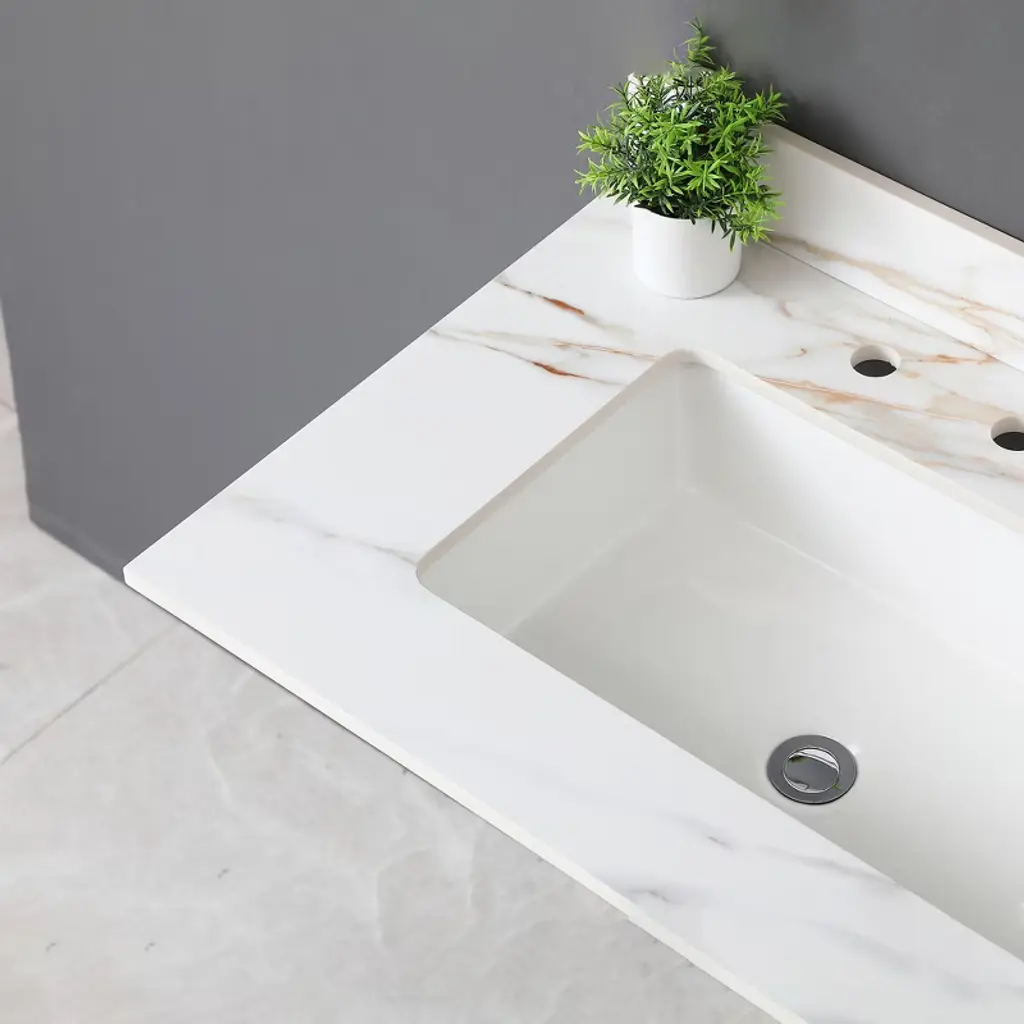 This vanity tops are made of beautiful sintered stone, we select a more premium sintered stone slab with through-body marble veining, and cut the entire sintered stone slab into different sizes so that the marble veining is different for each vanity top. Our marble vanity tops are complemented with large rectangle undermount ceramic sinks for easier washing up. Sturdy sintered stone vanity tops are fired at high temperatures for a smooth, hard surface that keeps stubborn stains away and stays shiny for a long time.