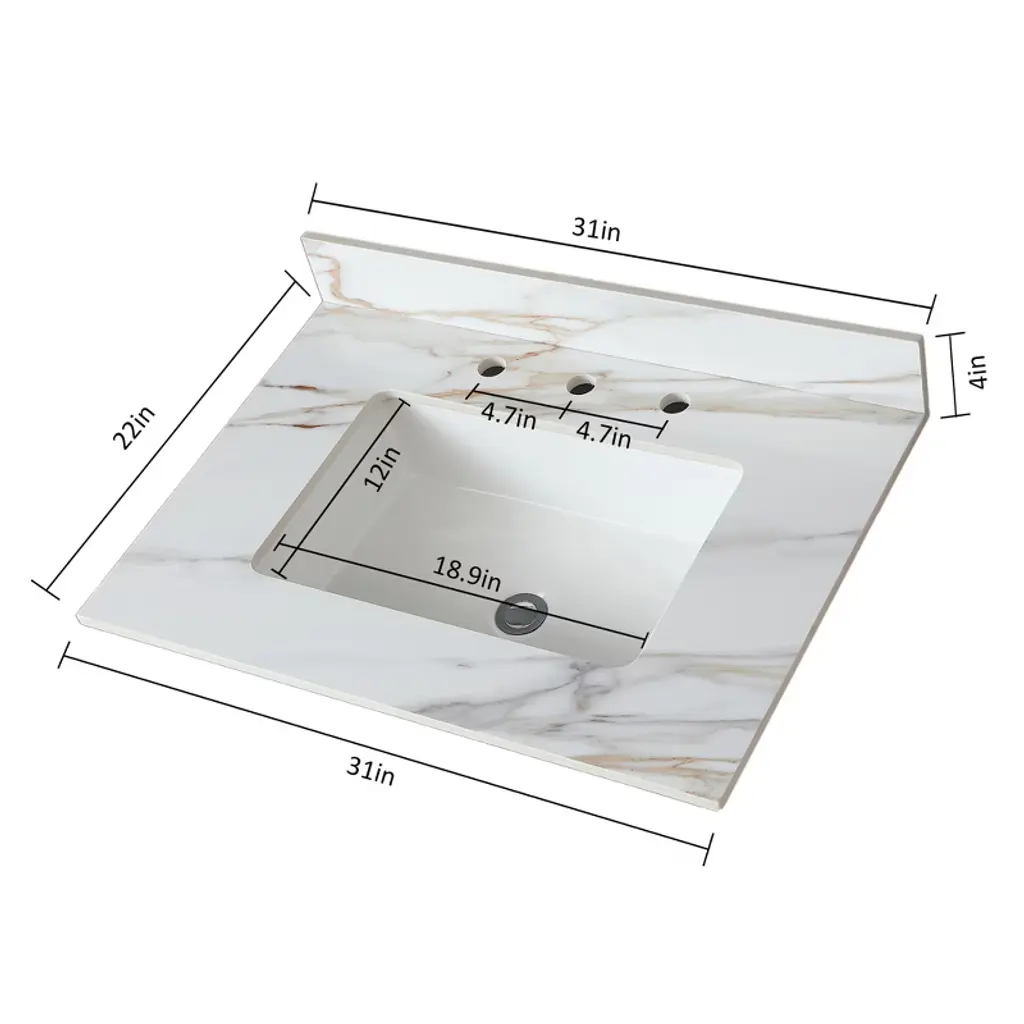 Kwpzqeb 31"marble Vanity Top, With Undermount Rectangular Middle Sink And 4" Height Backsplash, 3 Predrilled Centerset, Carrara White With Veins