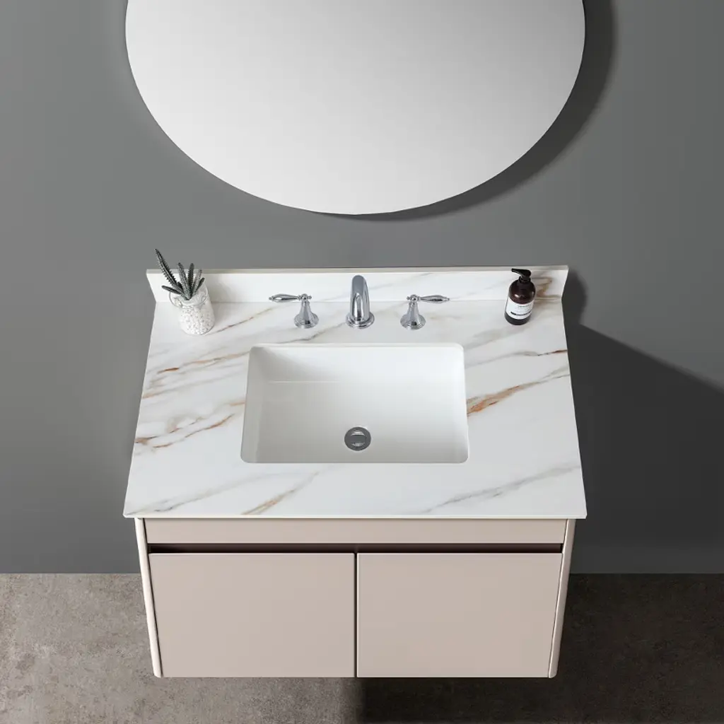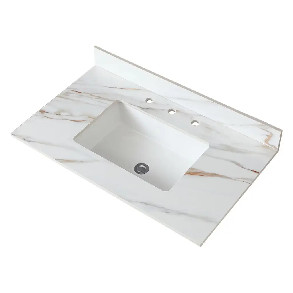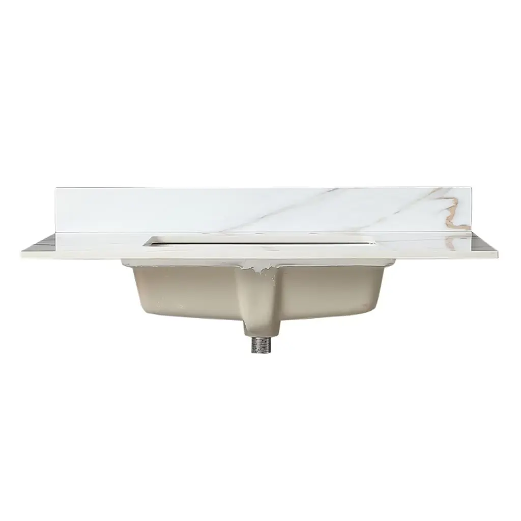 This vanity tops are made of beautiful sintered stone, we select a more premium sintered stone slab with through-body marble veining, and cut the entire sintered stone slab into different sizes so that the marble veining is different for each vanity top. Our marble vanity tops are complemented with large rectangle undermount ceramic sinks for easier washing up. Sturdy sintered stone vanity tops are fired at high temperatures for a smooth, hard surface that keeps stubborn stains away and stays shiny for a long time.