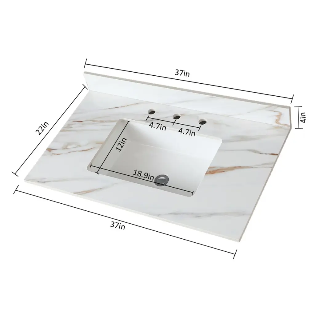 Kwpzqeb 37"marble Vanity Top, With Undermount Rectangular Middle Sink And 4" Height Backsplash, 3 Predrilled Centerset, Carrara White With Veins