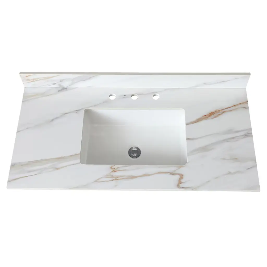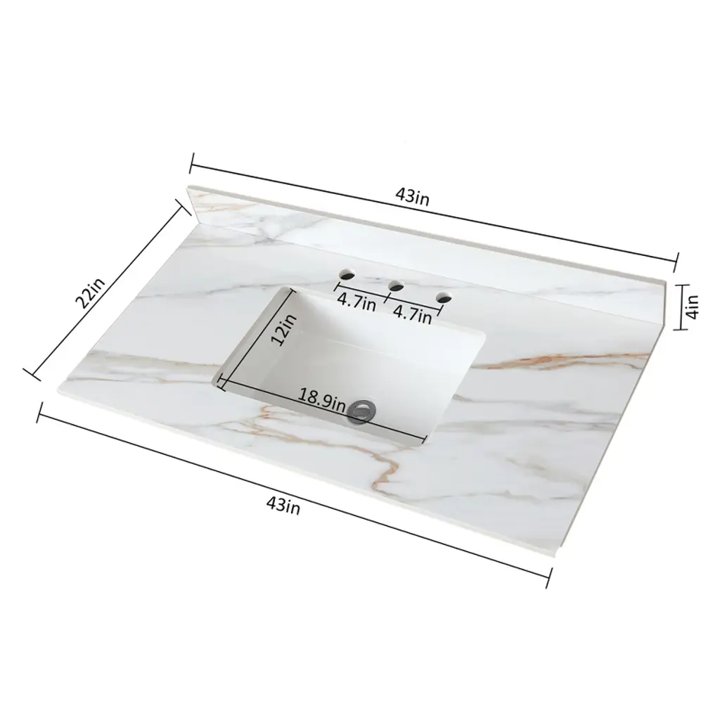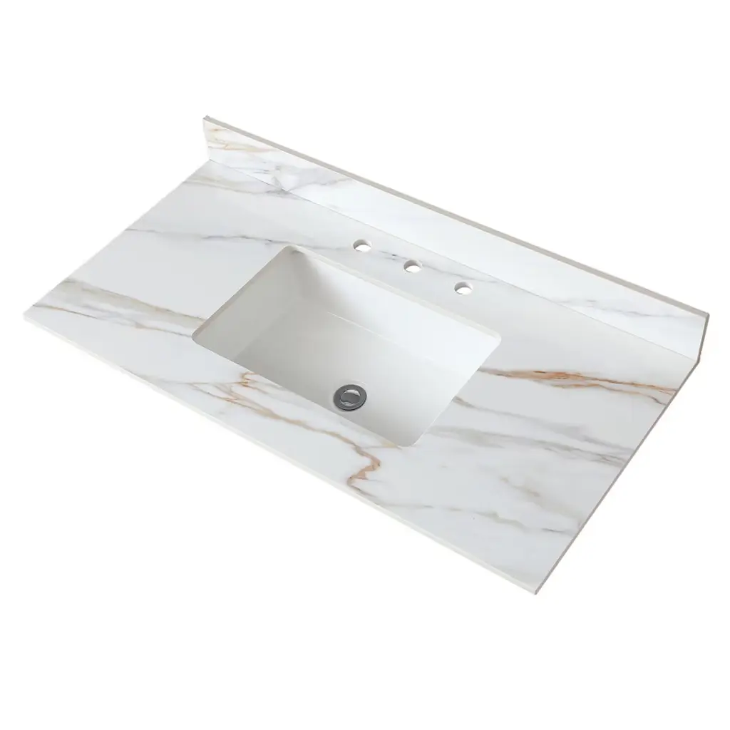 This vanity tops are made of beautiful sintered stone, we select a more premium sintered stone slab with through-body marble veining, and cut the entire sintered stone slab into different sizes so that the marble veining is different for each vanity top. Our marble vanity tops are complemented with large rectangle undermount ceramic sinks for easier washing up. Sturdy sintered stone vanity tops are fired at high temperatures for a smooth, hard surface that keeps stubborn stains away and stays shiny for a long time.