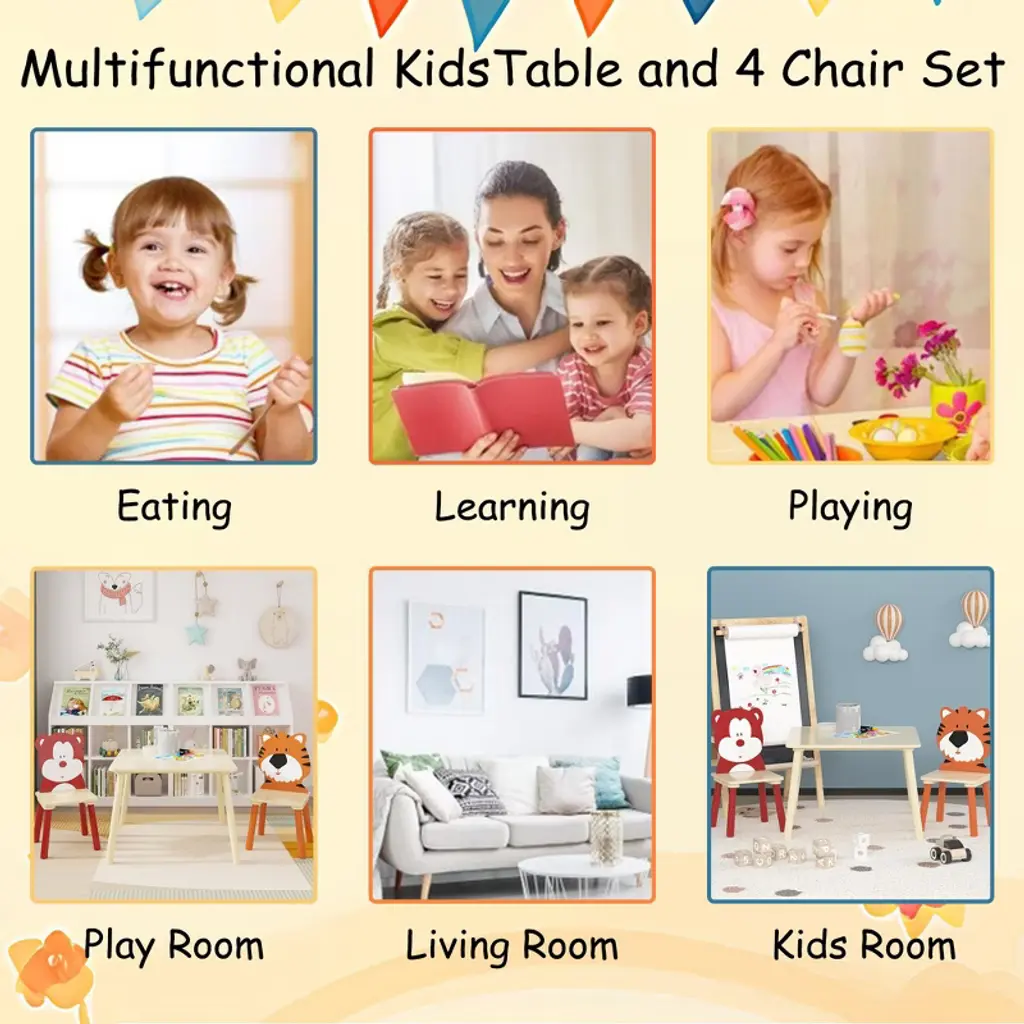 Kwpzqeb Kids Table And 2 Chairs Set, 3 Pieces Toddler Table And Chair Set, Wooden Activity Play Table Set For Classroom, Daycare, Home(bear&tiger)