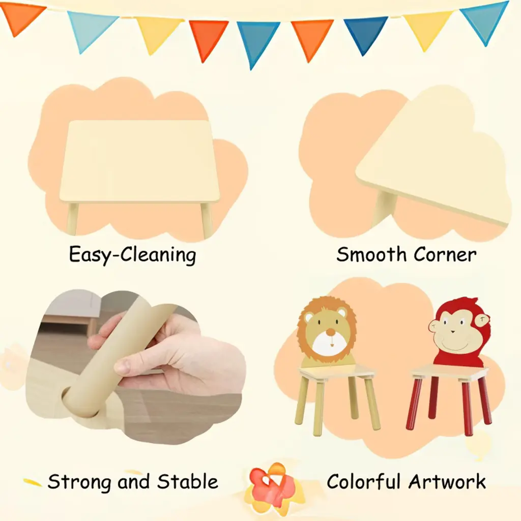 Kwpzqeb Kids Table And 2 Chairs Set, 3 Pieces Toddler Table And Chair Set, Wooden Activity Play Table Set For Classroom, Daycare, Home(lion&monkey)