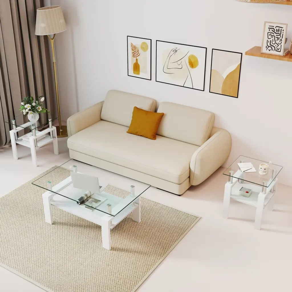 Kwpzqeb Set Of 2 Modern Tempered Glass Tea Table, Metal Frame With Storage Shelves, Coffee Table With Modern Style For Living Room, Transparent/white