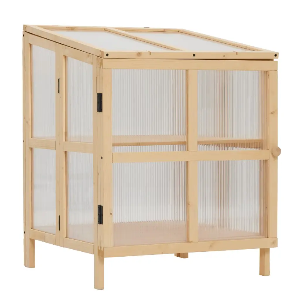 This wooden cold-bed greenhouse features a foldable design, allowing for quick and easy assembly in just a few steps. When folded, it takes up minimal space, making it easy to store and save space. The roof can be fixed or opened two ways, providing healthy ventilation for your plants in all weather conditions. It also comes with five high-quality clear polycarbonate panels, ensuring your plants receive maximum sunlight for optimal photosynthesis.