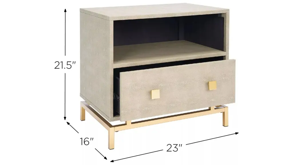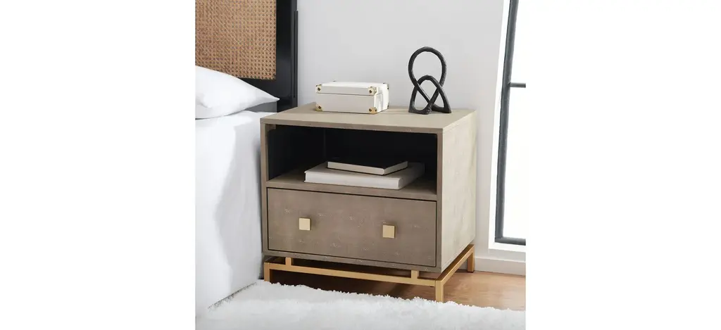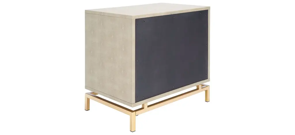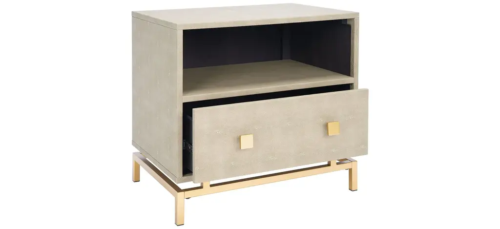 This Kyla Nightstand translates Art Deco design into the language of modern glamour, making it an unmistakable style statement. Kyla's raised open base and brass accent details give its neutral light taupe finish a decidedly lavish look.