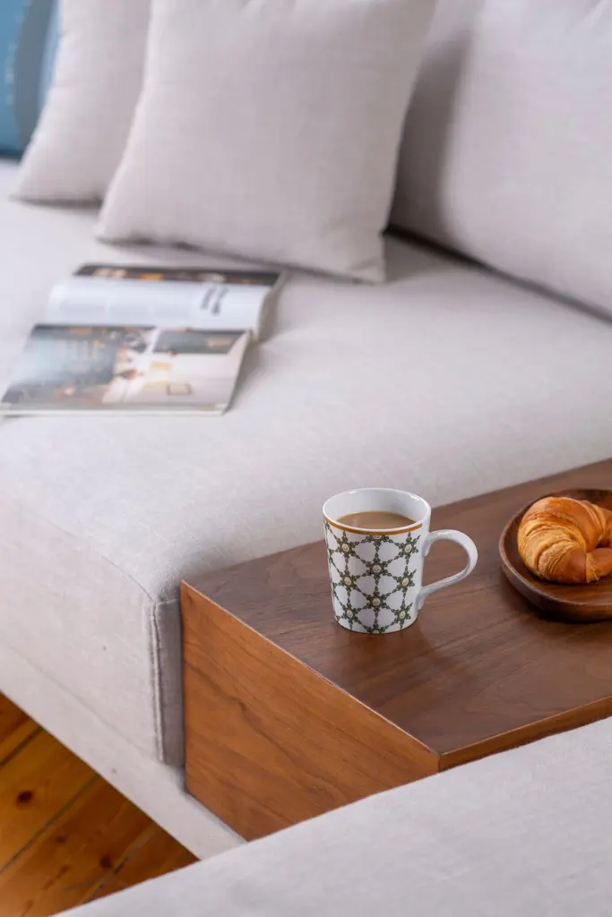 L-Shaped Sofa with Built-in Walnut Side Table with Foam and Fiber Filling.Clean lines and an embedded Walnut wood tray make this L-shaped sofa feel like a floating island. Our Floating sofa's frame is made of wood, with a moveable built-in side table, semi-firm foam for the seat and soft fiber for the back cushions. Sink in with a book and a warm cup of tea into your favorite corner in the room. Can be made in different sizes.