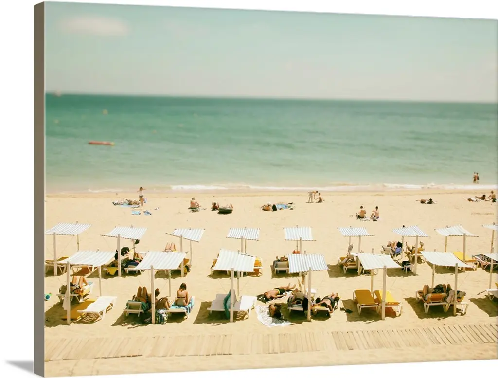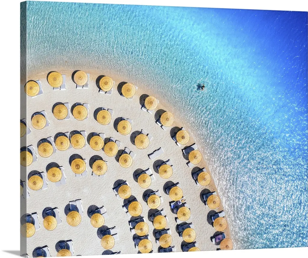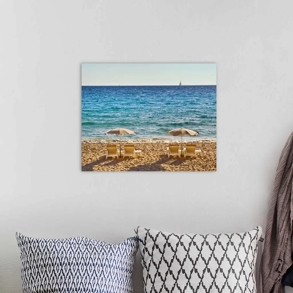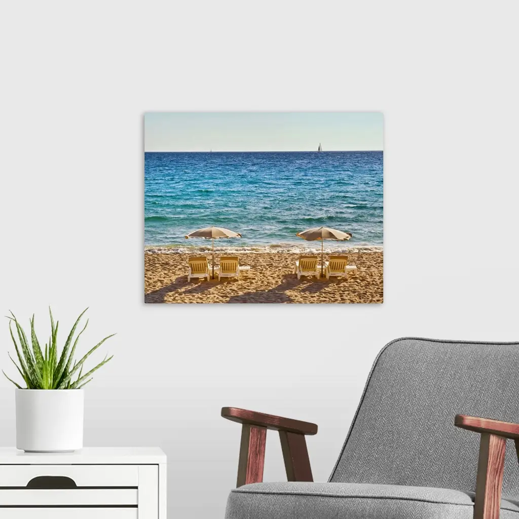 Two sets of beach chairs and umbrellas sit in the sand looking out at the ocean view with a sail boat that appears to sit on the horizon.