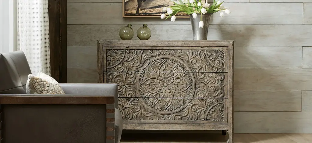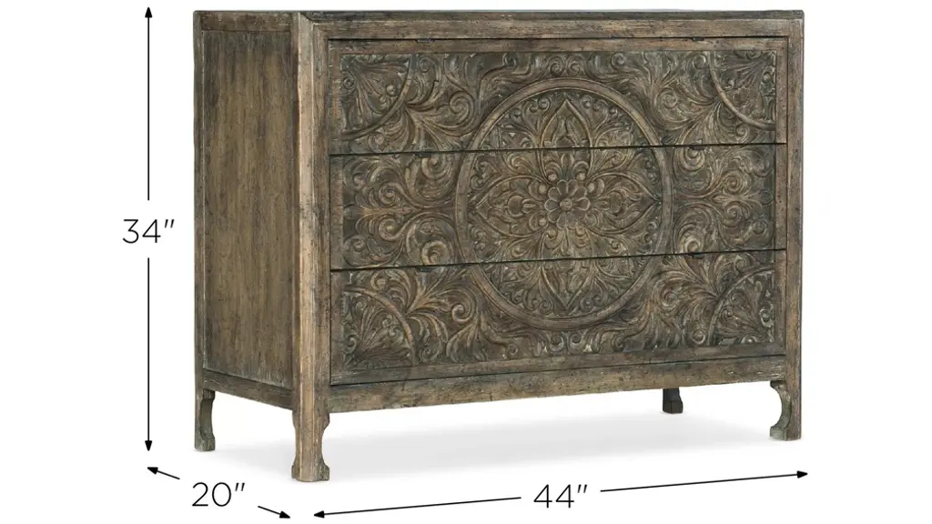 Rustic, romantic and rooted in authentic American character, the Lockhart La Grange Accent Chest exudes style savvy with carved drawer fronts punctuated by a circle motif in the center of the case and the charming medium distressed wood Washoff finish, inspired by antiques found in the Hill Country of Texas. Crafted of Pecky Hickory Veneers, the Lockhart has 3 roomy drawers.