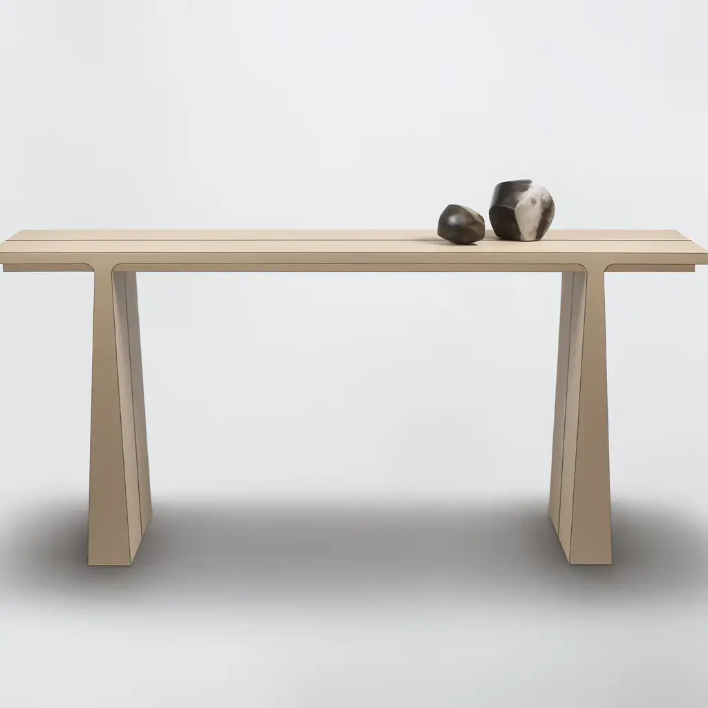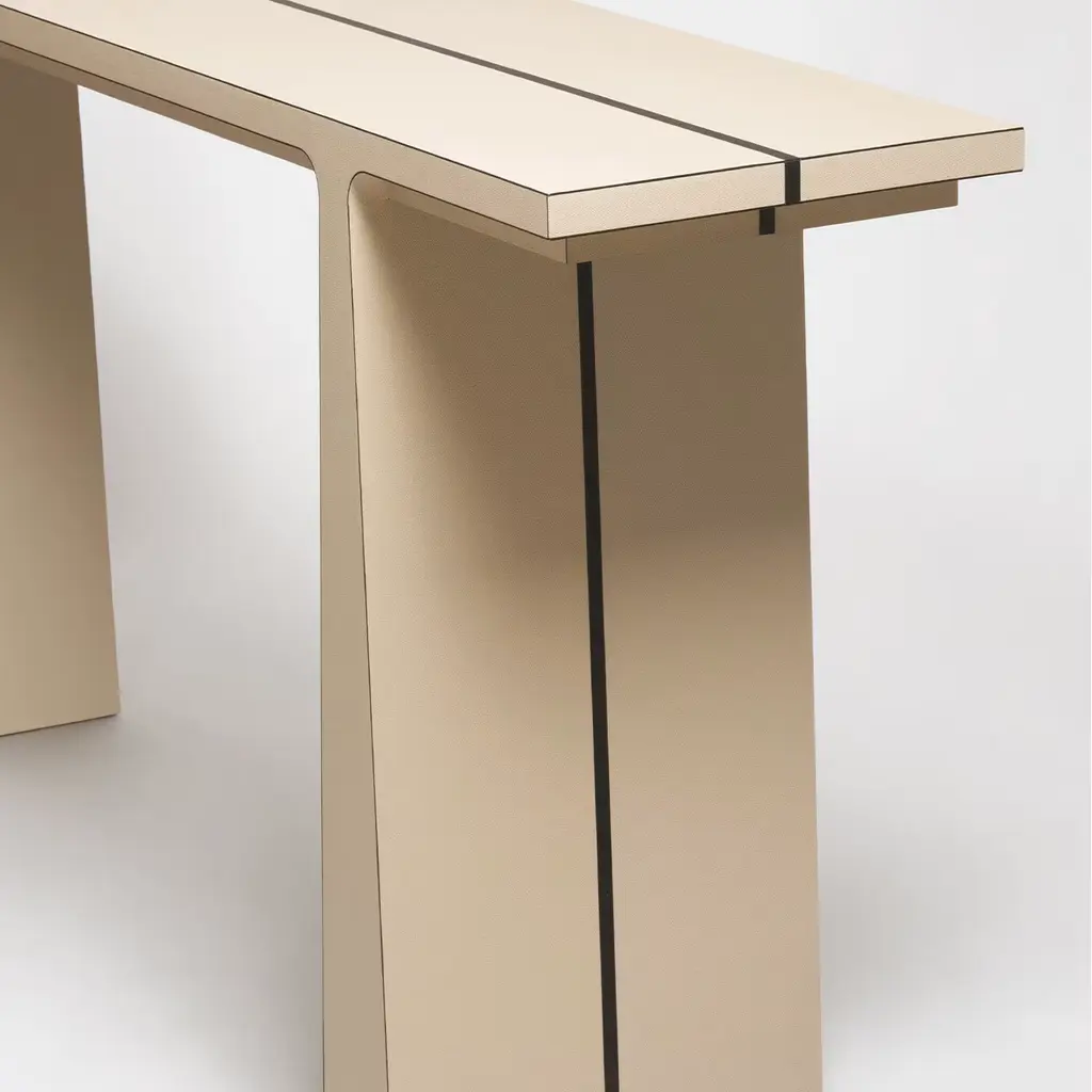 Designed by Stéphane Parmentier, this remarkable console will set the stage for a floral arrangement, a collection of decorative objects or a unique lighting fixture with its simple yet stylish silhouette. Entirely clad in soft beige leather, the rectangular top stands on two imposing legs with a slightly flared silhouette. The name of the collection La Linea ("the line" in English) describes the distinctive line that marks the center of each piece, following the entire geometry of the design.