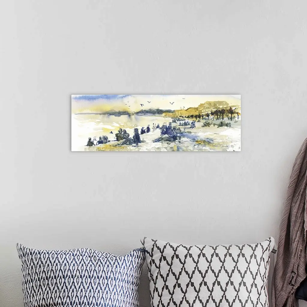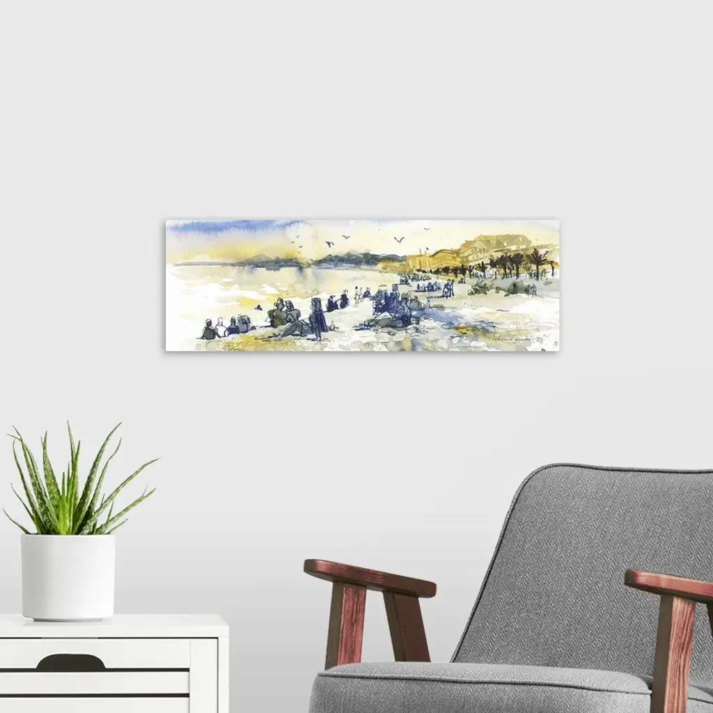 The beach by the city of Nice, France, is rocky, scenic, and full of people enjoying the days, whatever they may bring. The artist captured an impression in watercolor & ink at sunset.