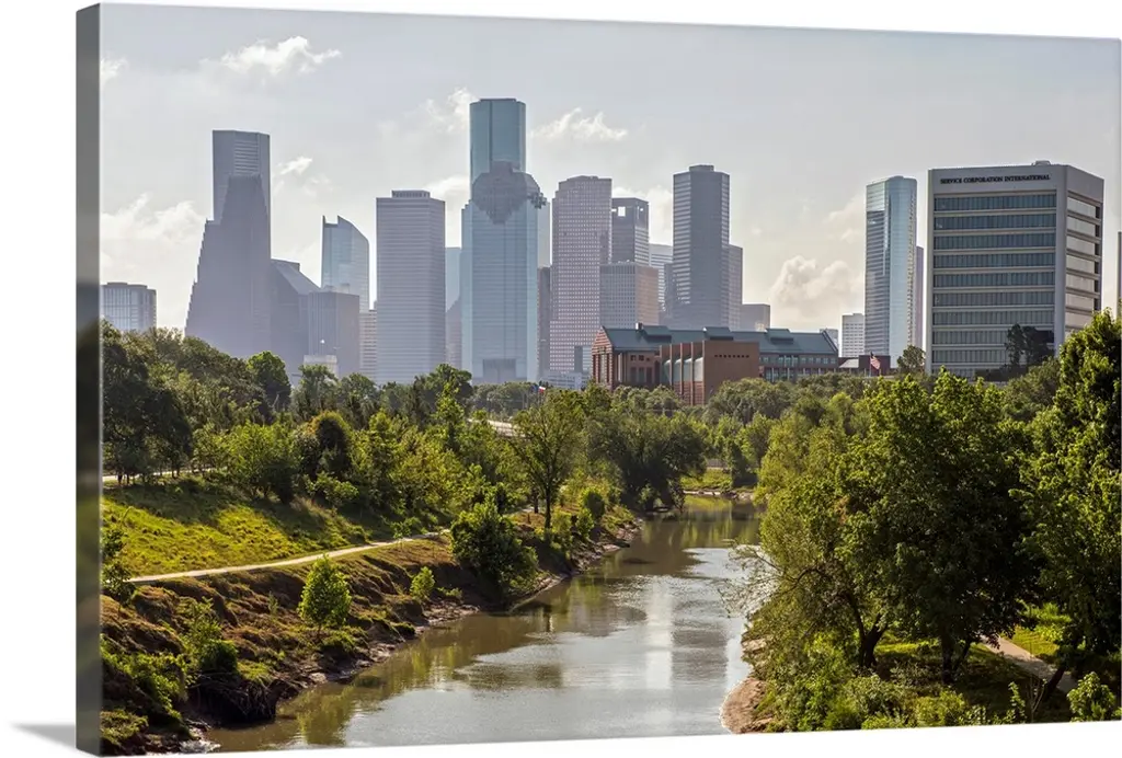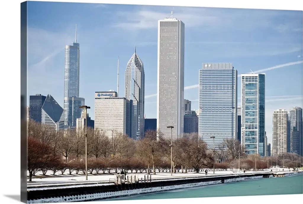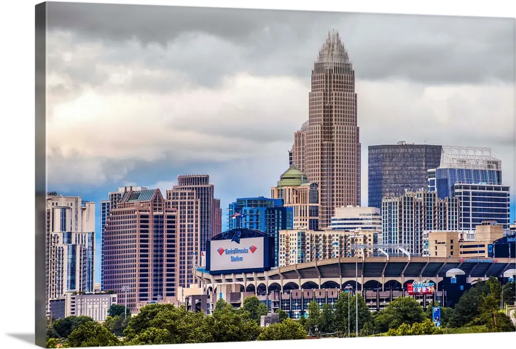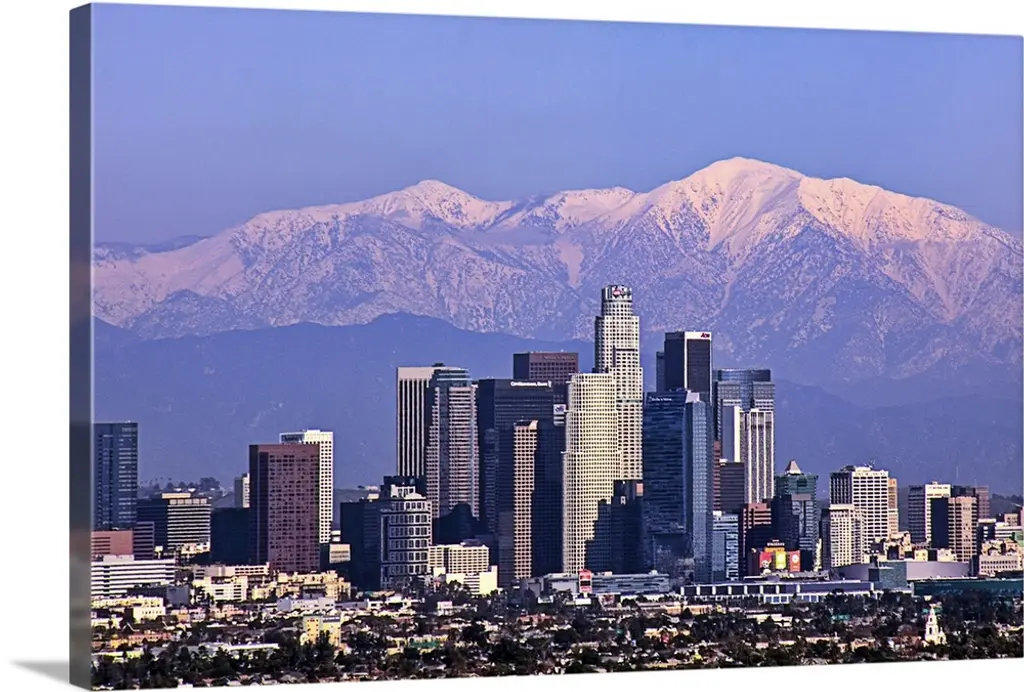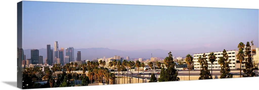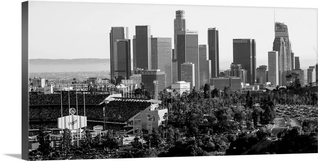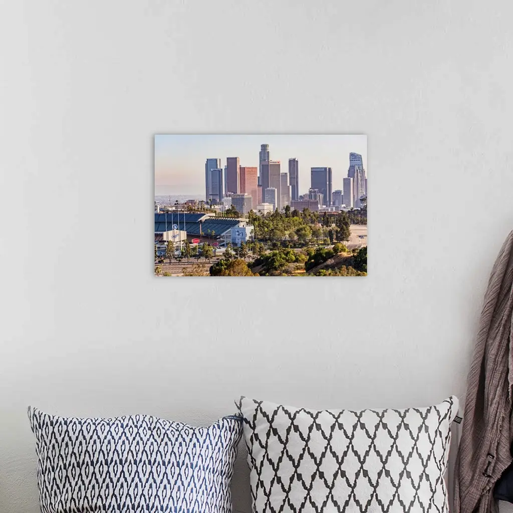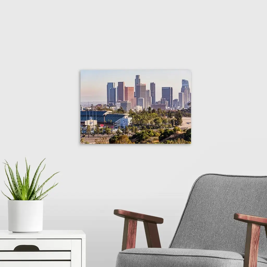 Photograph of the downtown Los Angeles skyline with Dodger Stadium on the left.