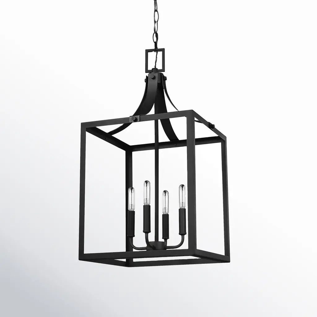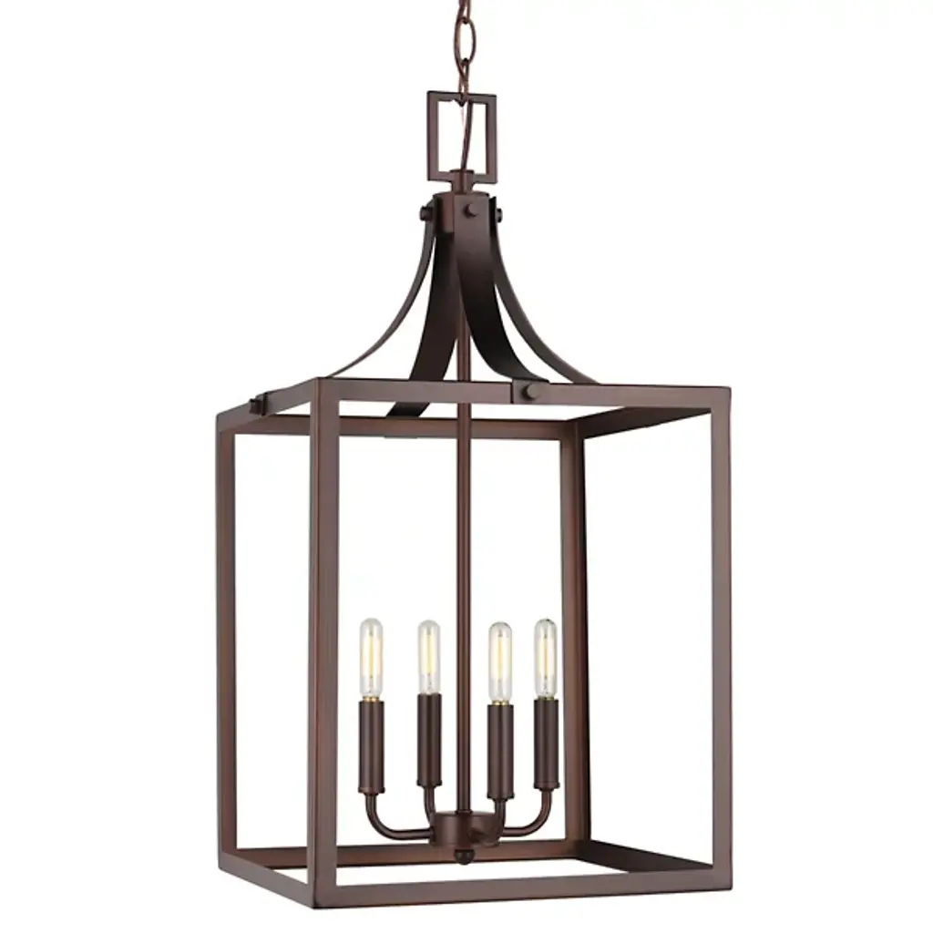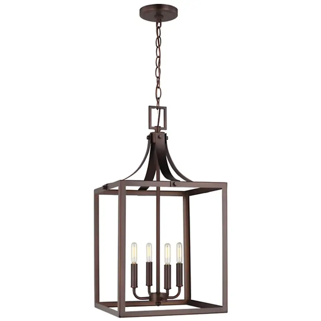 The Generation Lighting, formerly known as Sea Gull Lighting, Labette Large Foyer Pendant uses 4 exposed bulbs living within a lantern-like open frame to imbue design and style into your living space. Install in multiples for a truly dramatic effect. Height adjustable at installation allowing for your own artistic input.