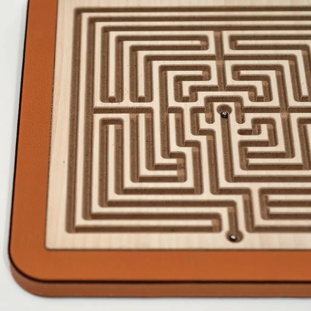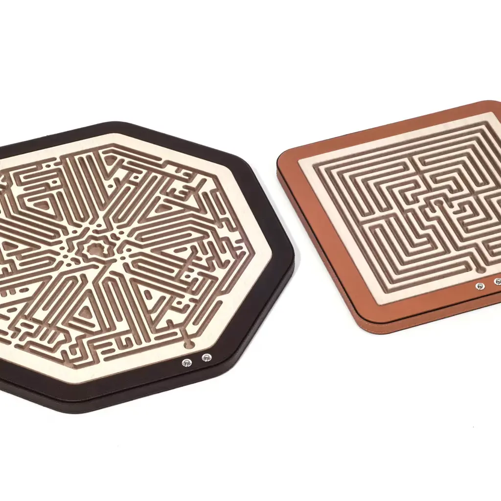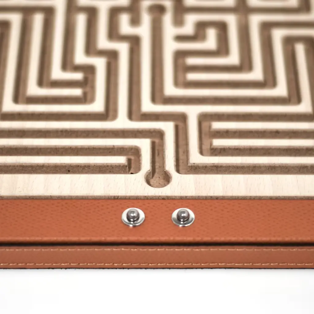 This simple, square maze offers a startlingly high amount of visual complexity. The lines and contrasts that make up its labyrinthine structure play off each other to create a pulsating, optical effect. The item is laser cut and finished in leather. It is also available in any leather or finish featured in the catalog.