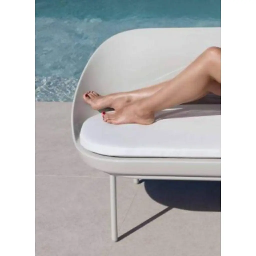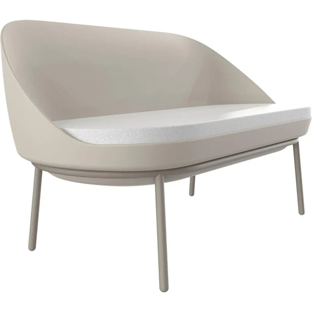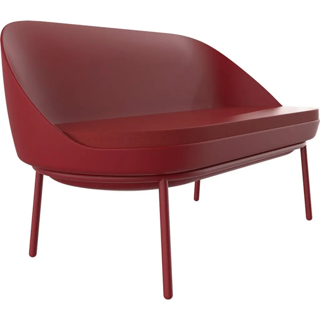 Lace black sofs with cushion by MOWEEDimensions: D66 x W135 x H75.5 cmMaterial: polyethylene, stainless steelWeight: 21 kgAlso Available in different colours and finishes. Lace is a collection of furniture made by rotomoulding. Its shape resembles a swollen body that looks tightened by a loop and deforms to create a double volume. The distinguishing feature of the collection is the reduction of plastic volumes by incorporating metal structures into the design that lighten the visual weight of the pieces.Möwee is part of the work, effort and commitment of Gaviota, a leading company in the outdoor sector. It was set up as an independent venture to broaden horizons in the outdoor furniture world, with its own distinctive character and way of doing things. Freshness, simplicity, quality and design are at the heart of its DNA.