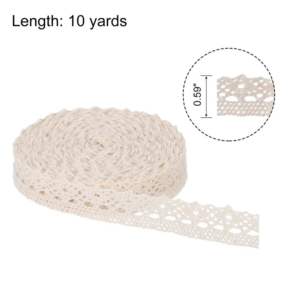 What is this?This lace ribbon has a total length of 10 yards and a width of 0.39 inch, making it suitable for various DIY projects such as gift wrapping, headbands crafting, wedding decorations, and more.What will I get?Lace ribbon x 1;Material:cotton;Length: 10 yards;Width: 0.39 inchColor: Beige;Are there any advantages of the product?The lace ribbon is made of cotton material, which makes it comfortable and soft to the touch. It also has elasticity, allowing it to stretch easily for easy application in different objects and surfaces. This product is versatile and can be used for multiple purposes, such as creating hair accessories, decorating home items and clothes.How to use it?You can cut the ribbon to the desired length using scissors and add any embellishment you like, such as beads or pearls. The elastic material allows you to wrap it around any object tightly to create a seamless and decorative look.What should I notice?Handle the ribbon carefully to prevent it from tearing. It is recommended to store the ribbon in a dry and cool place to ensure its quality and longevity.