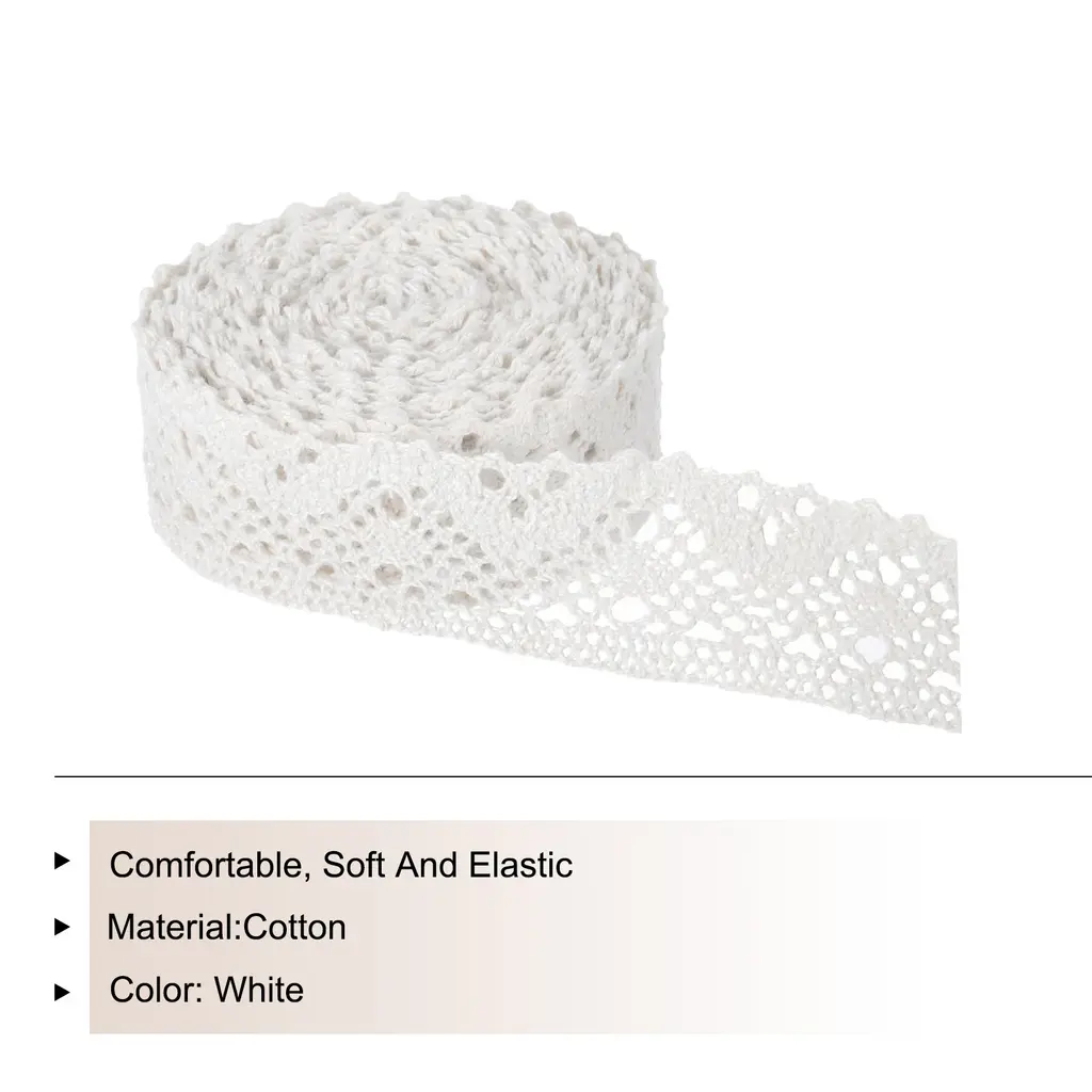 What is this?This lace ribbon has a total length of 10 yards and a width of 1.2 inch, making it suitable for various DIY projects such as gift wrapping, headbands crafting, wedding decorations, and more.What will I get?Lace ribbon x 1;Material:cotton;Length: 10 yards;Width: 1.2 inchColor: White;Are there any advantages of the product?The lace ribbon is made of cotton material, which makes it comfortable and soft to the touch. It also has elasticity, allowing it to stretch easily for easy application in different objects and surfaces. This product is versatile and can be used for multiple purposes, such as creating hair accessories, decorating home items and clothes.How to use it?You can cut the ribbon to the desired length using scissors and add any embellishment you like, such as beads or pearls. The elastic material allows you to wrap it around any object tightly to create a seamless and decorative look.What should I notice?Handle the ribbon carefully to prevent it from tearing. It is recommended to store the ribbon in a dry and cool place to ensure its quality and longevity.