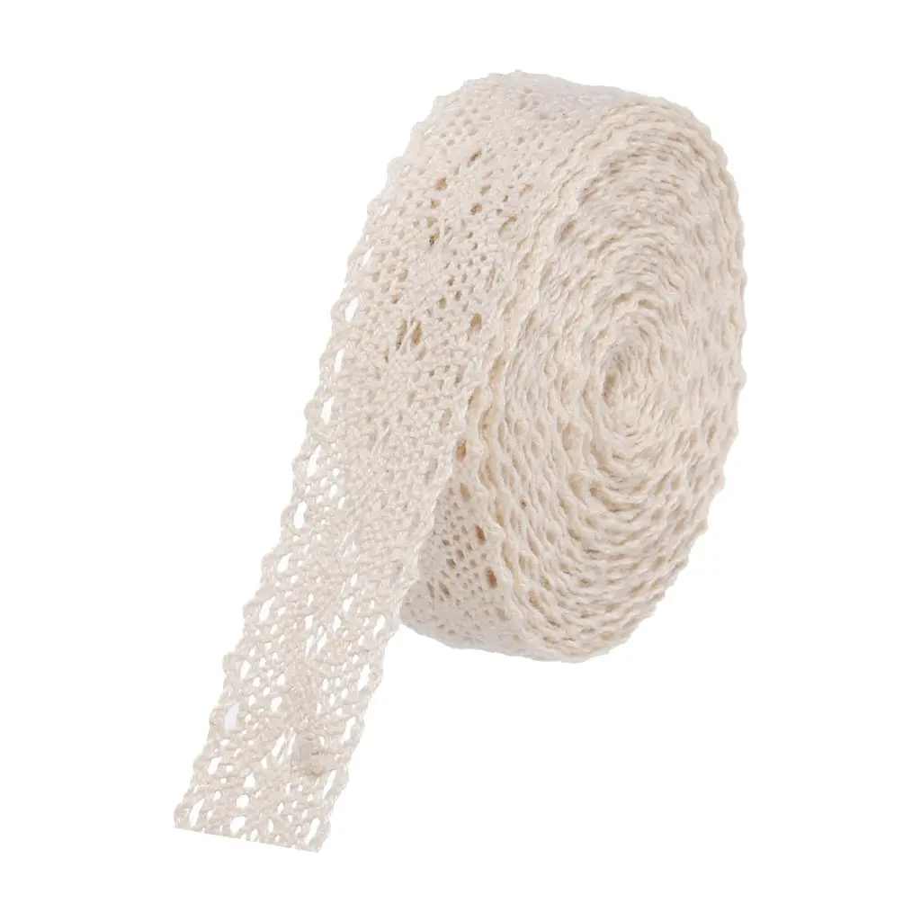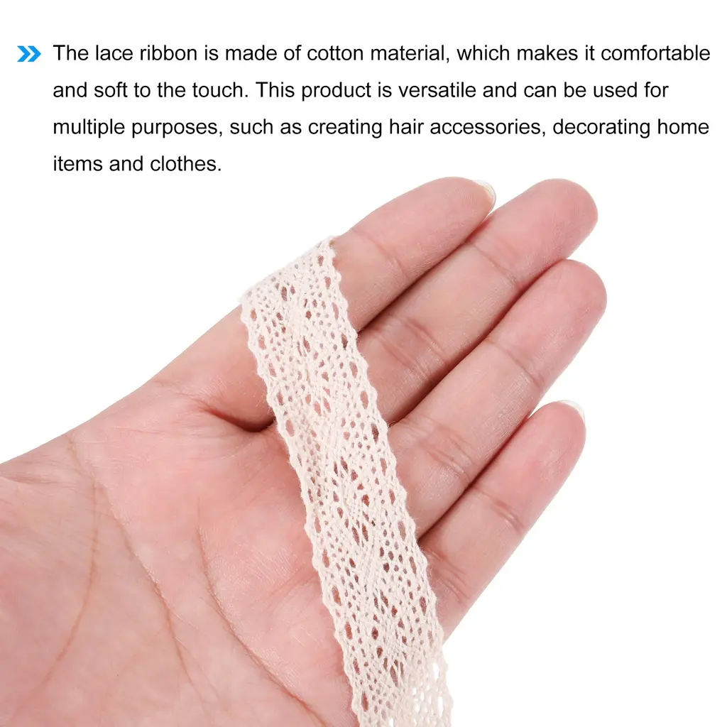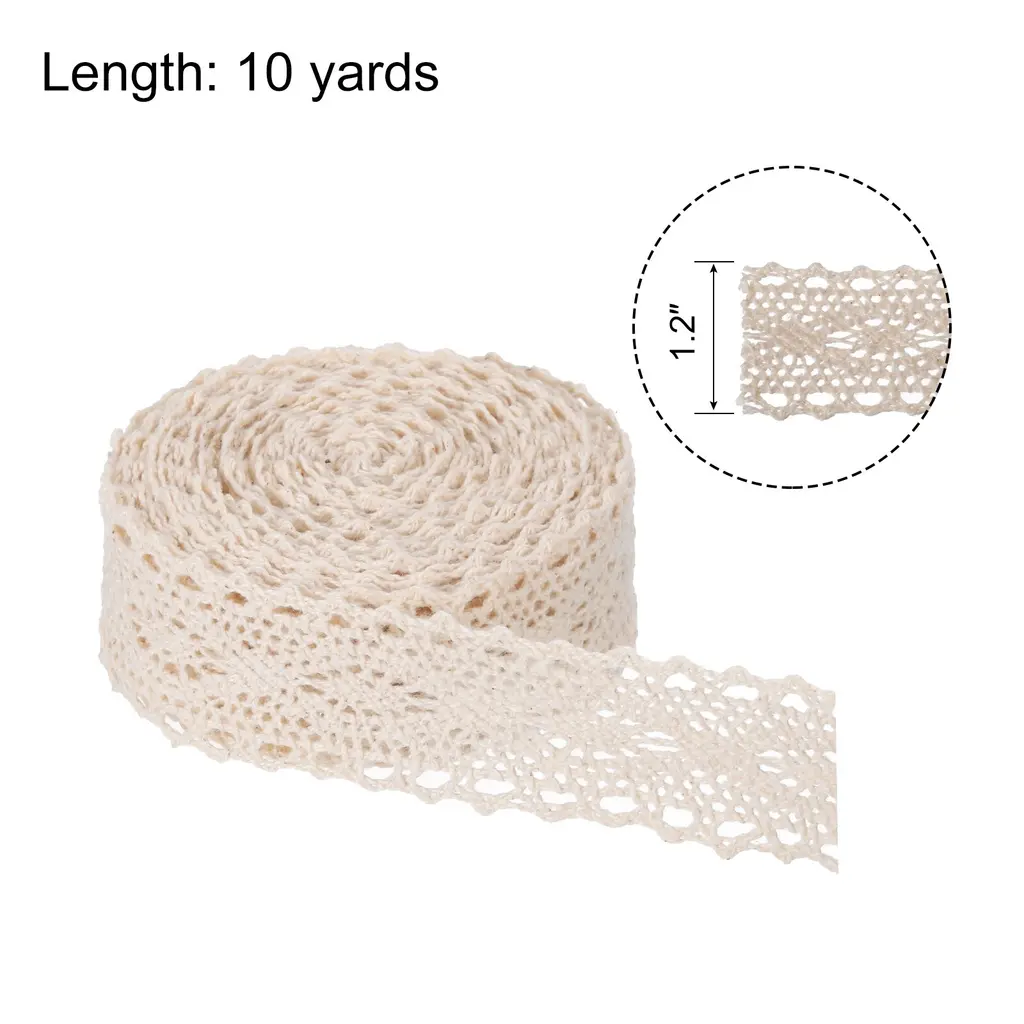 What is this?This lace ribbon has a total length of 10 yards and a width of 1 inch, making it suitable for various DIY projects such as gift wrapping, headbands crafting, wedding decorations, and more.What will I get?Lace ribbon x 1;Material:cotton;Length: 10 yards;Width: 1 inchColor: Beige;Are there any advantages of the product?The lace ribbon is made of cotton material, which makes it comfortable and soft to the touch. This product is versatile and can be used for multiple purposes, such as creating hair accessories, decorating home items and clothes.How to use it?You can cut the ribbon to the desired length using scissors and add any embellishment you like, such as beads or pearls. The cotton material allows you to wrap it around any object tightly to create a seamless and decorative look.What should I notice?Handle the ribbon carefully to prevent it from tearing. It is recommended to store the ribbon in a dry and cool place to ensure its quality and longevity.