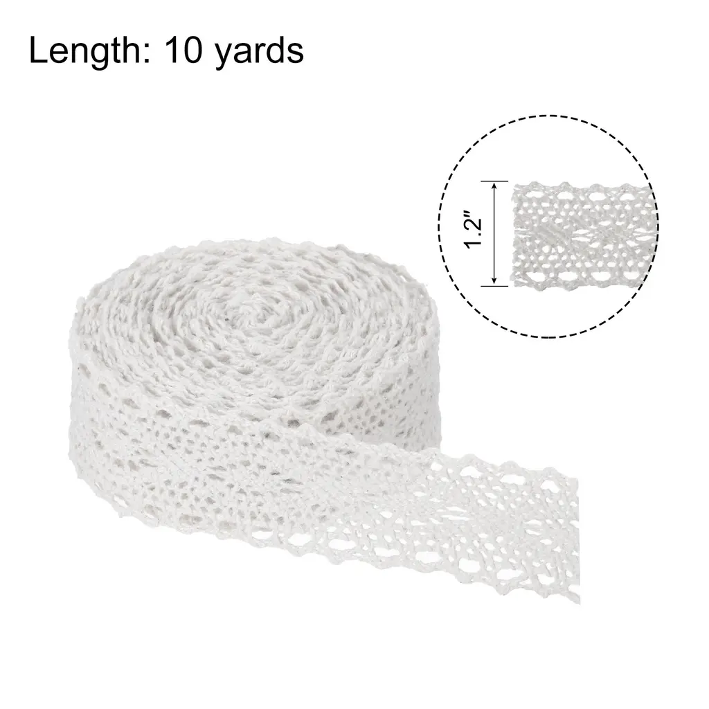 What is this?This lace ribbon has a total length of 10 yards and a width of 1.2 inch, making it suitable for various DIY projects such as gift wrapping, headbands crafting, wedding decorations, and more.What will I get?Lace ribbon x 1;Material:cotton;Length: 10 yards;Width: 1.2 inchColor: White;Are there any advantages of the product?The lace ribbon is made of cotton material, which makes it comfortable and soft to the touch. It also has elasticity, allowing it to stretch easily for easy application in different objects and surfaces. This product is versatile and can be used for multiple purposes, such as creating hair accessories, decorating home items and clothes.How to use it?You can cut the ribbon to the desired length using scissors and add any embellishment you like, such as beads or pearls. The elastic material allows you to wrap it around any object tightly to create a seamless and decorative look.What should I notice?Handle the ribbon carefully to prevent it from tearing. It is recommended to store the ribbon in a dry and cool place to ensure its quality and longevity.