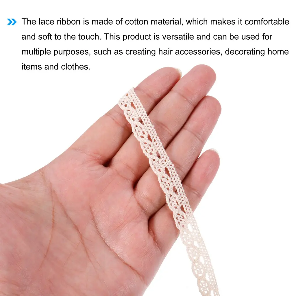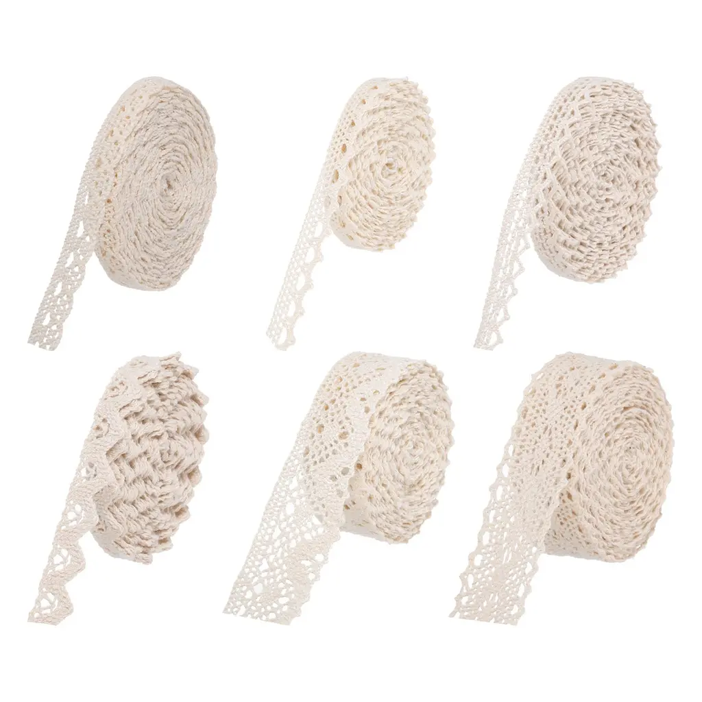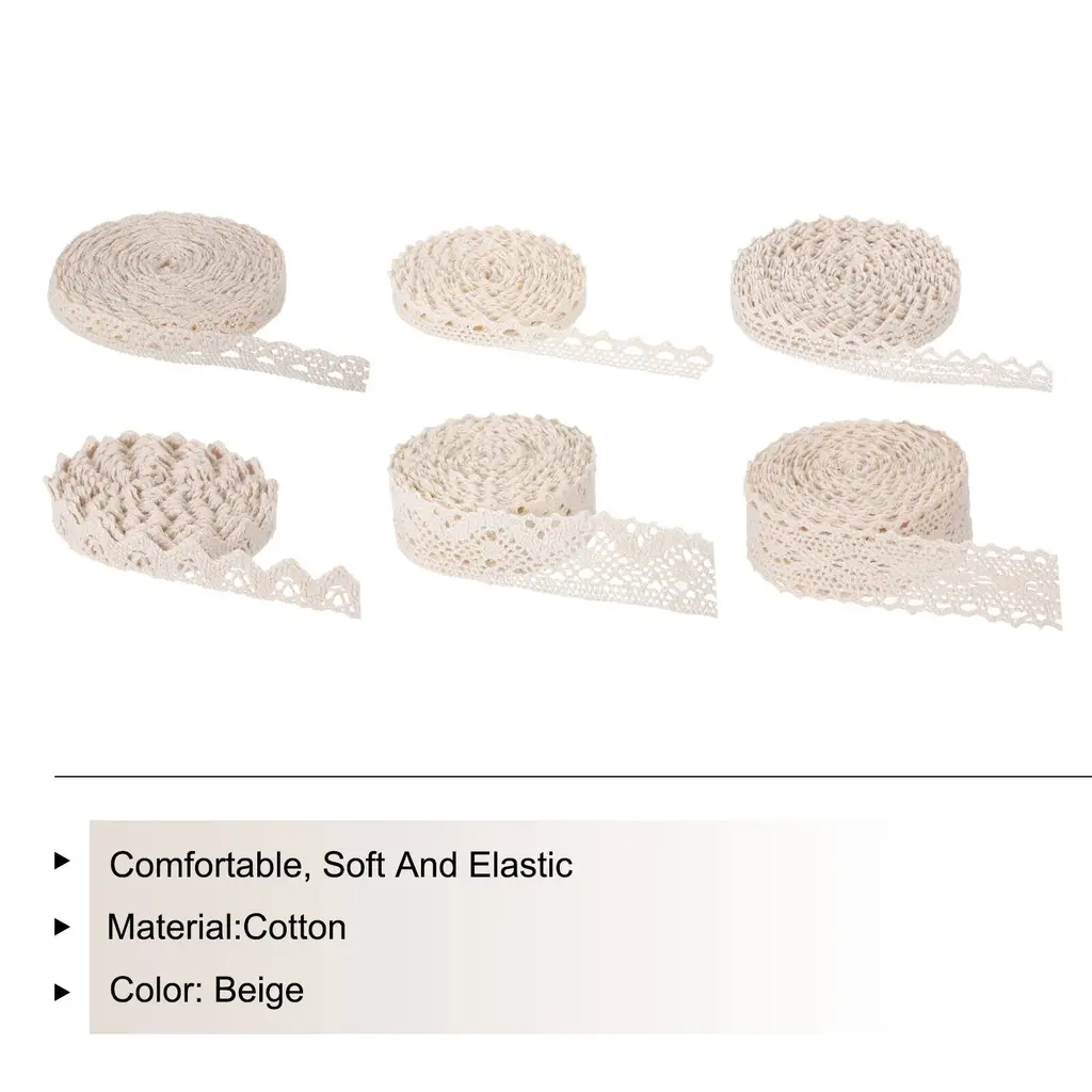 What is this?This lace ribbon has a total length of 30 yards and a width of inch, making it suitable for various DIY projects such as gift wrapping, headbands crafting, wedding decorations, and more.What will I get?Lace ribbon x 6 include:Style 2-0.39 inch,Style 4-0.39 inch,Style 6-0.79 inch,Style 8-0.51 inch,Style 10-0.59 inch,Style 14-1.2 inch;Each lace ribbon has 5yards length;Total Length: 30 yards;Material:Cotton;Color: Beige;Are there any advantages of the product?The lace ribbon is made of cotton material, which makes it comfortable and soft to the touch. It also has elasticity, allowing it to stretch easily for easy application in different objects and surfaces. This product is versatile and can be used for multiple purposes, such as creating hair accessories, decorating home items and clothes.How to use it?You can cut the ribbon to the desired length using scissors and add any embellishment you like, such as beads or pearls. The elastic material allows you to wrap it around any object tightly to create a seamless and decorative look.What should I notice?Handle the ribbon carefully to prevent it from tearing. It is recommended to store the ribbon in a dry and cool place to ensure its quality and longevity.