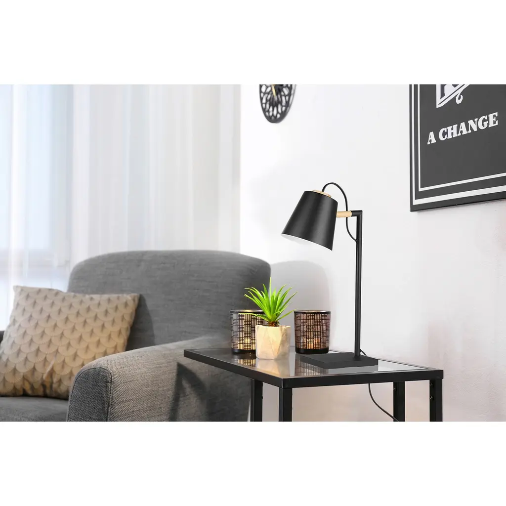 The Lacey table lamp by Eglo features a structured black finish w/ a natural wood accent. The metal shade is adjustable and has a structured black exterior and white interior finish. The black plug in cord measures 59" longMetal ShadeNatural Wood Accent59" CordSturdy Metal BaseSlim round bodyColor/Finish: Structured Black, WhiteMaterial: Steel, WoodSwitch Type: On/OffSwitch Location: CordSystem Type: Plug InBulb Included: NoFixture Dimmable: No
