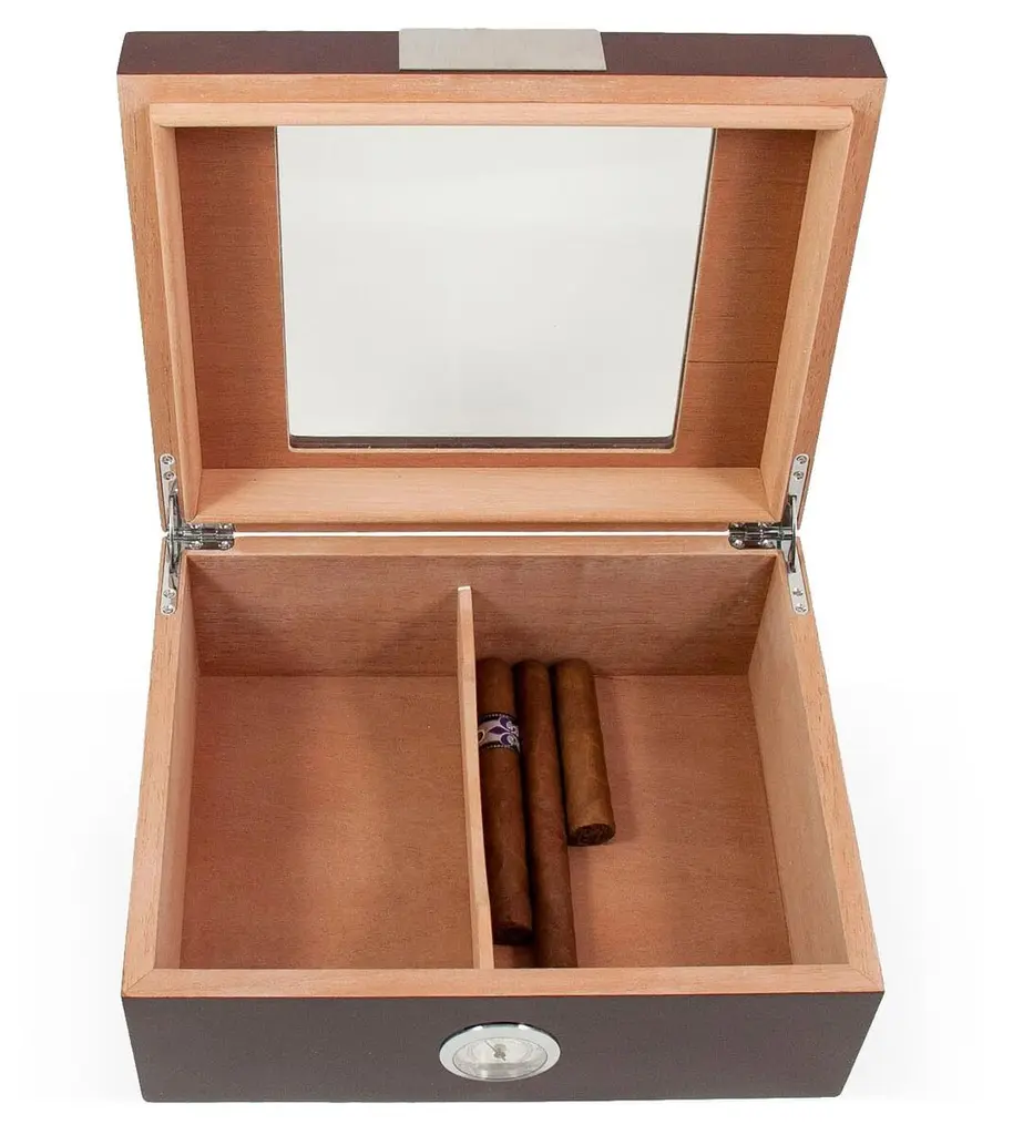 An accoutrement to enhance this time-honored gentleman's pleasure. A lacquered walnut wood humidor is lined with Spanish cedar. Holds up to 60 cigars and includes a hygrometer and humidistat.