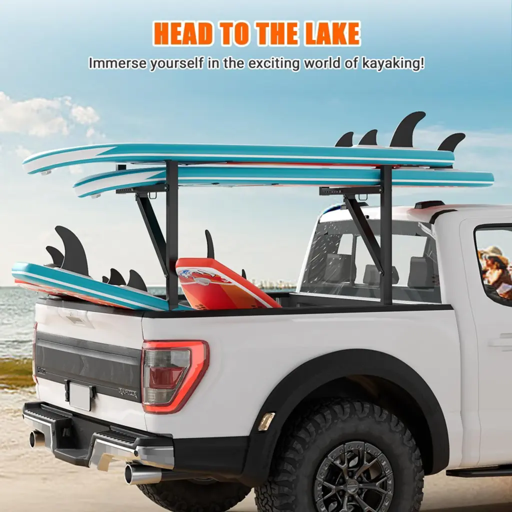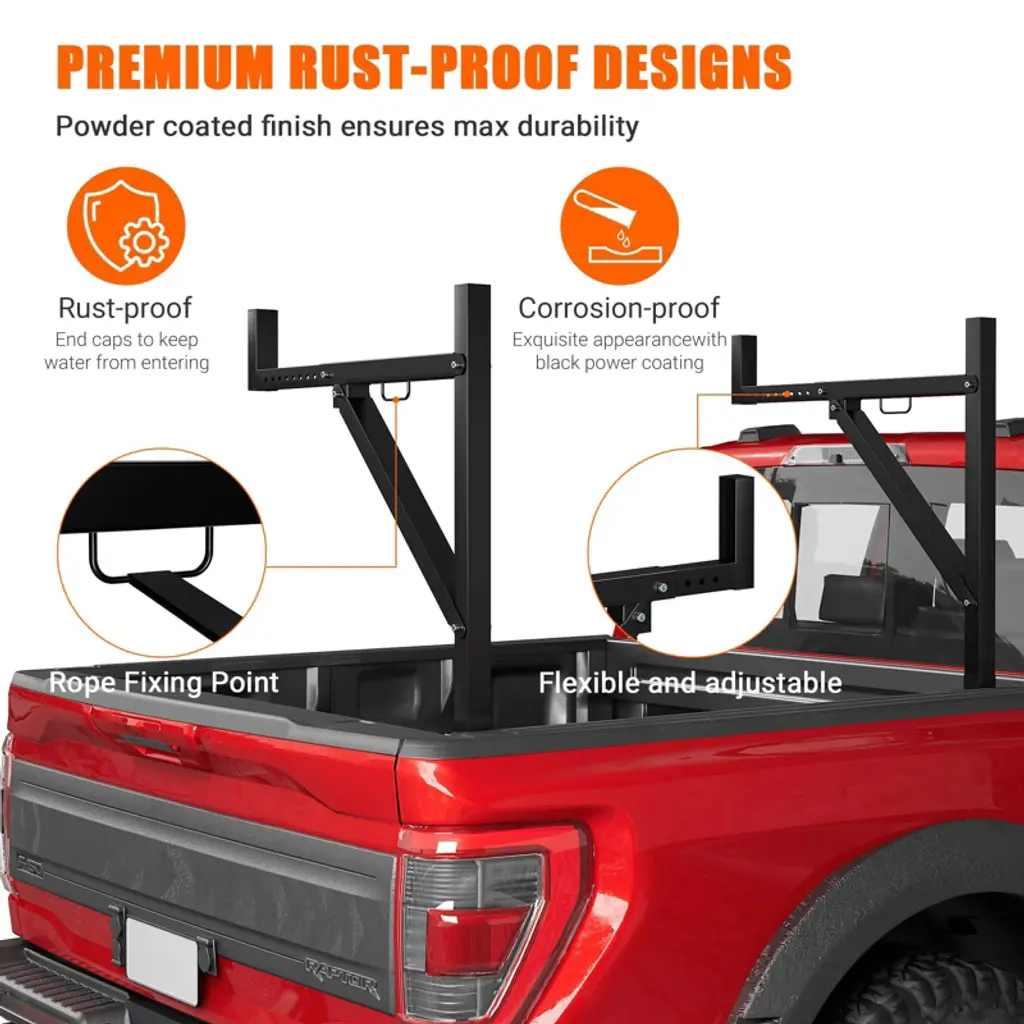 Truck Ladder Rack & Cargo Carrier ¨C Universal Adjustable Steel RackProduct Details:Universal Adjustable Fit SystemEngineered with fully adjustable shelf width (19"-34") and height (44.5"-49.5") to accommodate popular truck models including Ford F-Series, Chevrolet Silverado, and Dodge Ram. The versatile mounting system ensures secure installation across various truck bed sizes and configurations.Heavy-Duty 250-Pound Load CapacityConstructed to transport substantial cargo with a maximum weight capacity of 250 pounds. The robust design securely carries oversized items like ladders, kayaks, construction lumber, surfboards, and camping gear, effectively expanding your truck's utility.High-Strength Alloy Steel ConstructionBuilt from premium alloy steel with reinforced polyester foot pads for enhanced stability and vibration resistance. Integrated tie-down anchors and extended stop losses provide multiple securement points to prevent cargo shifting during transit.Quick-Install Bolt-On AssemblyFeatures a straightforward bolt mounting system that requires no vehicle modification. All necessary hardware is included for damage-free installation that can be completed without professional help. The rack can be easily removed when not needed.Weather-Resistant Powder CoatingProtected with a durable black powder coat finish that resists rust, corrosion, and UV damage. Sealed end caps prevent moisture and debris accumulation inside the tubing, ensuring long-term durability in all weather conditions.Product Parameters:Material: High-Strength Alloy SteelProduct Dimensions: 35.83"L x 8.66"W x 3.94"H (Collapsed)Load Capacity: 250 lbsAdjustable Width: 19" - 34"Adjustable Height: 44.5" - 49.5"Finish: Black Powder CoatedFeatures: Tie-Down Anchors, Polyester Foot Pads, Removable DesignCompatibility: Ford F-Series, Chevrolet Silverado, Dodge RamInstallation: Bolt-On, No Drilling Required