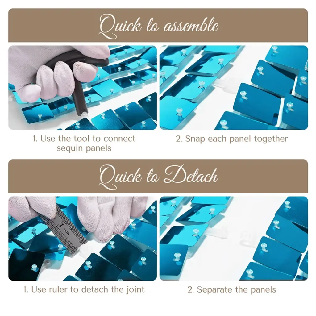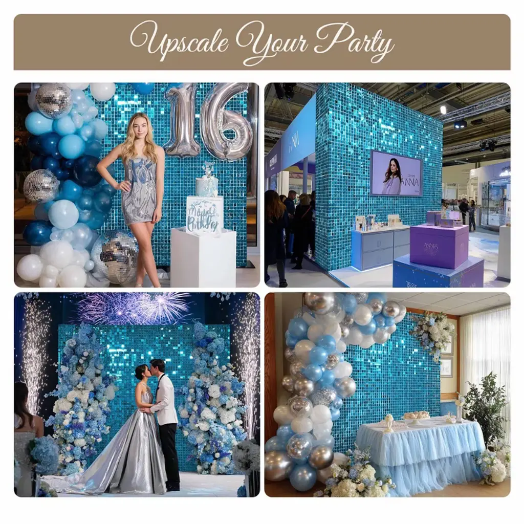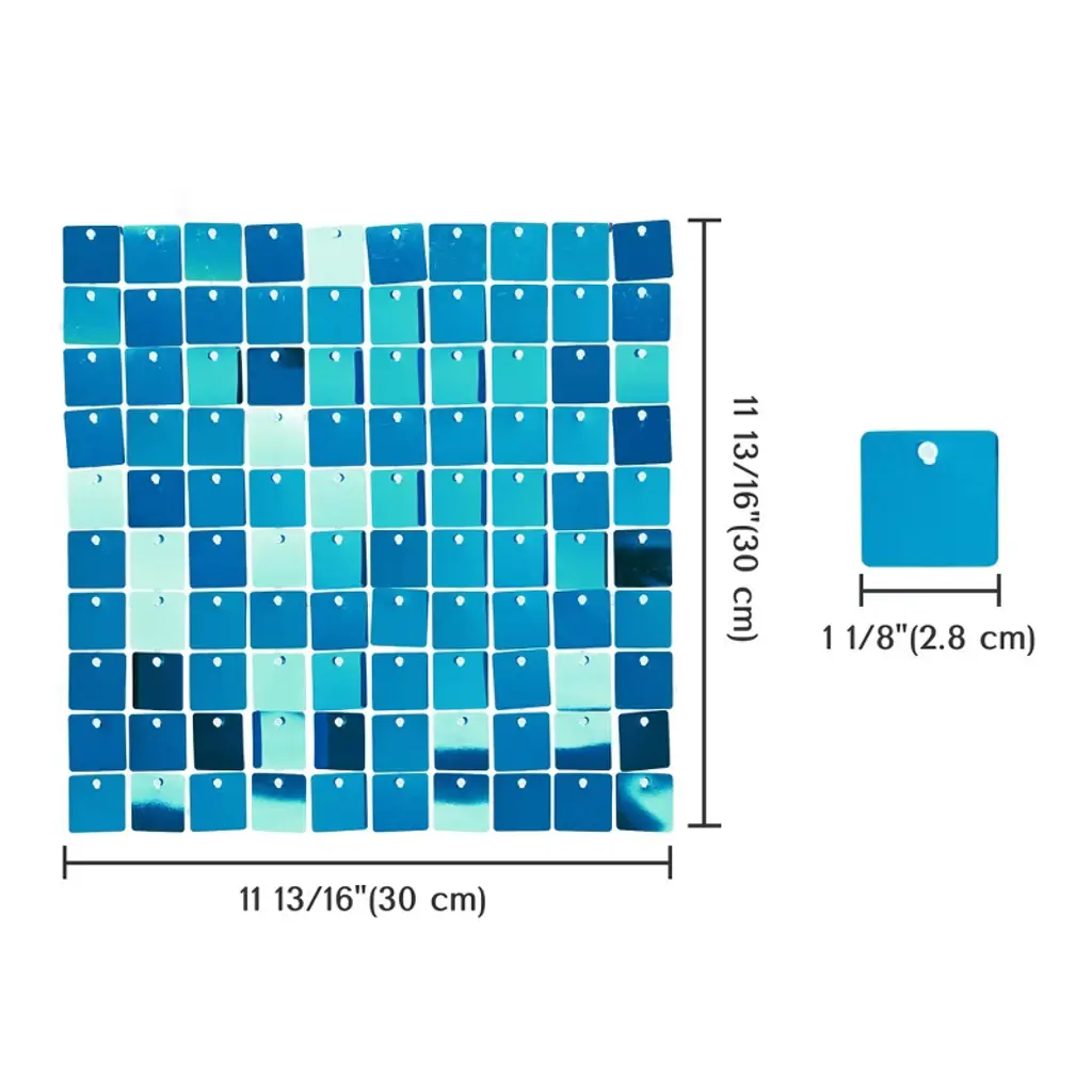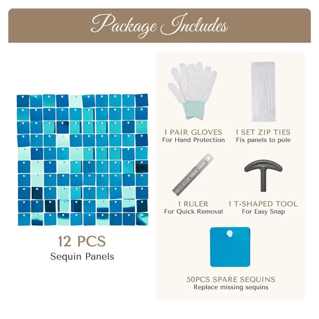 Features:- Sparkle & Shimmer - 12 Pcs Shimmer Wall Backdrop Panels feature dazzling sequins that reflect light, creating stunning visual effects. This party backdrop adds a touch of glam and elegance to any disco party decorations, making every snapshot unforgettable- DIY Backdrop Size - Free to splice the panels into your desired backdrop size to your needs, 12 panels can create a 4x3 ft or 6x2 ft size birthday backdrop or baby shower backdrop- Durable & Long-Lasting - Made of high-quality polymeric material that is not easy to fade or deform, the sequins maintain long-term luster and brightness, ensuring captivating sparkles for this blue backdrop that last for years- Easy Assembly & Disassembly - Each panel is very lightweight and easy to install, simply snap each panel together, and attach the assembled panels on the frame with zip ties. Easy to detach the panels and ready for the next use, making decoration hassle-free- Upscale Your Party - Provides a highly reflective backdrop with dynamic effects of light and shadow, suitable for prom night, birthday party, baby shower, bridal shower, wedding reception, tea party decoration, masquerade party, graduation party, launch party, trade show booth display. Pair it with disco ball balloons for a fun and festive atmosphereSpecifications:- Assembled Overall Dimension(WxH) 3 11/12 ft x 2 11/12 ft (120 x 90 cm)- Panel Size(LxW) 11 13/16" x 11 13/16" (30 x 30 cm)- Sequin Size(LxW) 1 1/8" x 1 1/8" (2.8 x 2.8 cm)- Net Weight 1.3 Lbs (0.6 kg)Package Contents:- 12x Shimmer Wall Backdrop Panels- 1 Pair of Gloves- 1x Ruler- 1 Set of Zip Ties- 50x Spare Sequins- 1x Installation Tool- 1x ManualNotice: - Please note that the backdrop stand is NOT included.