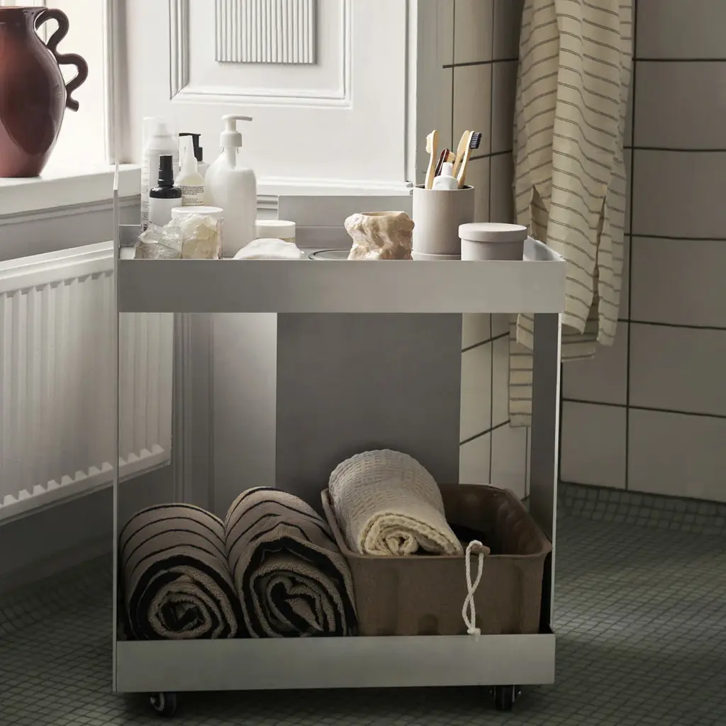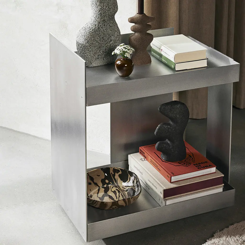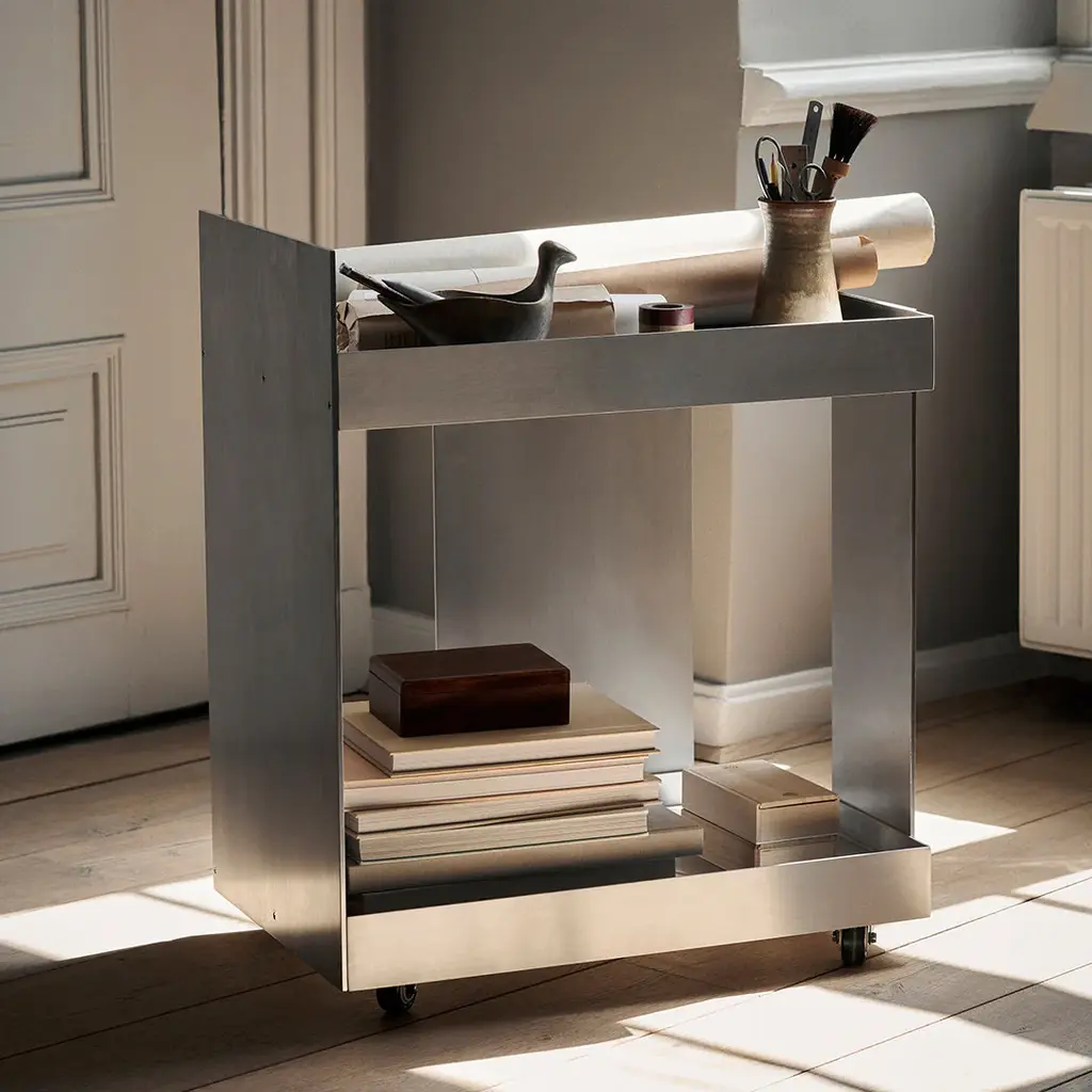 Named after the Danish word for 'warehouse', the Lager Trolley finds its inspiration in the raw and industrial aesthetic associated with brutalism. This sculptural trolley serves as both a visually captivating piece and a functional addition to your home. Utilize it as a stylish bar cart, elegantly displaying your favorite glasses and refreshments, or as a versatile side table or practical storage solution in your home office. The geometric design ensures a unique expression from every angle, while the wheels provide effortless mobility, allowing you to easily move it around to suit your needs. Experience the perfect blend of form and function with the Lager Trolley, a striking piece that adds character and utility to any space.