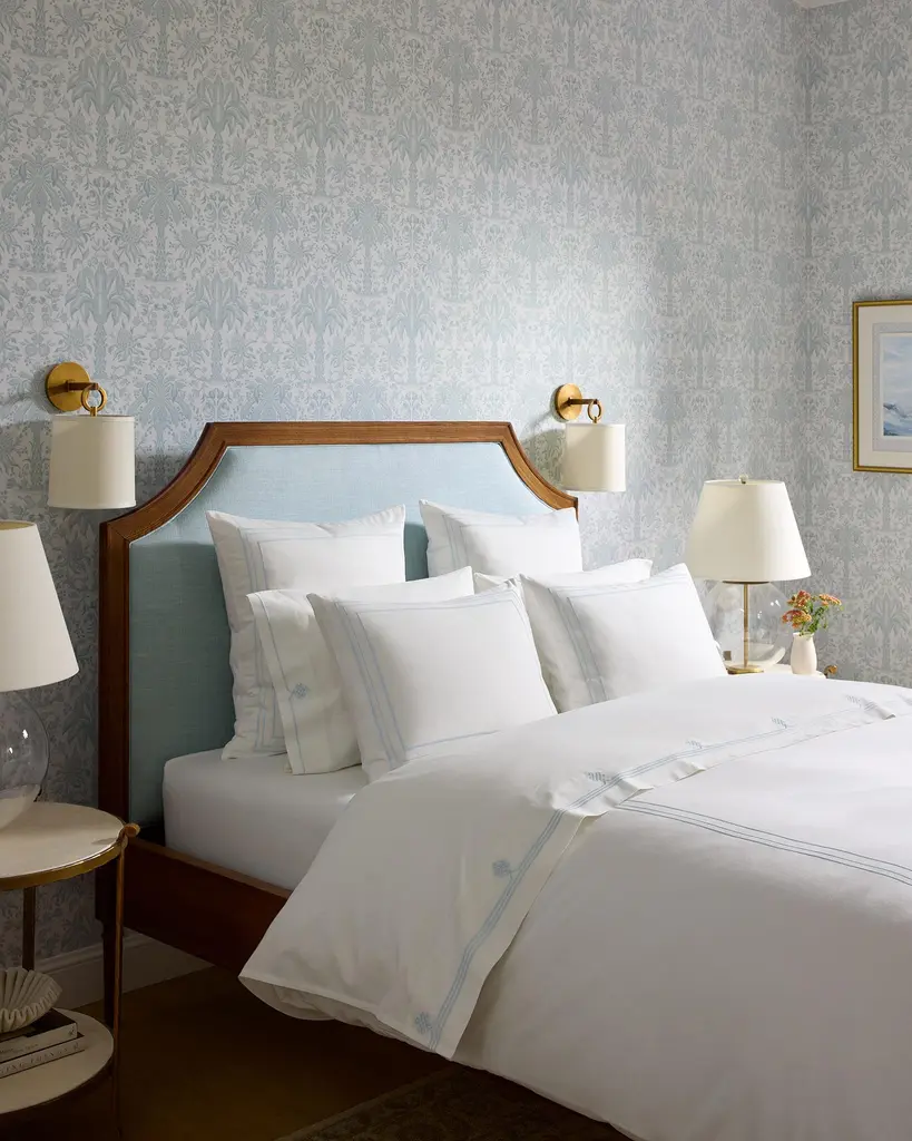 A lovely notched frame. An upholstered headboard acts as a canvas for pale sky blue linen.