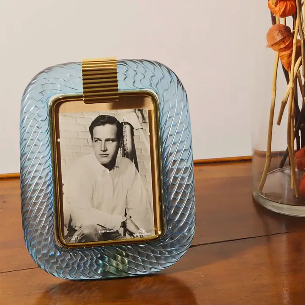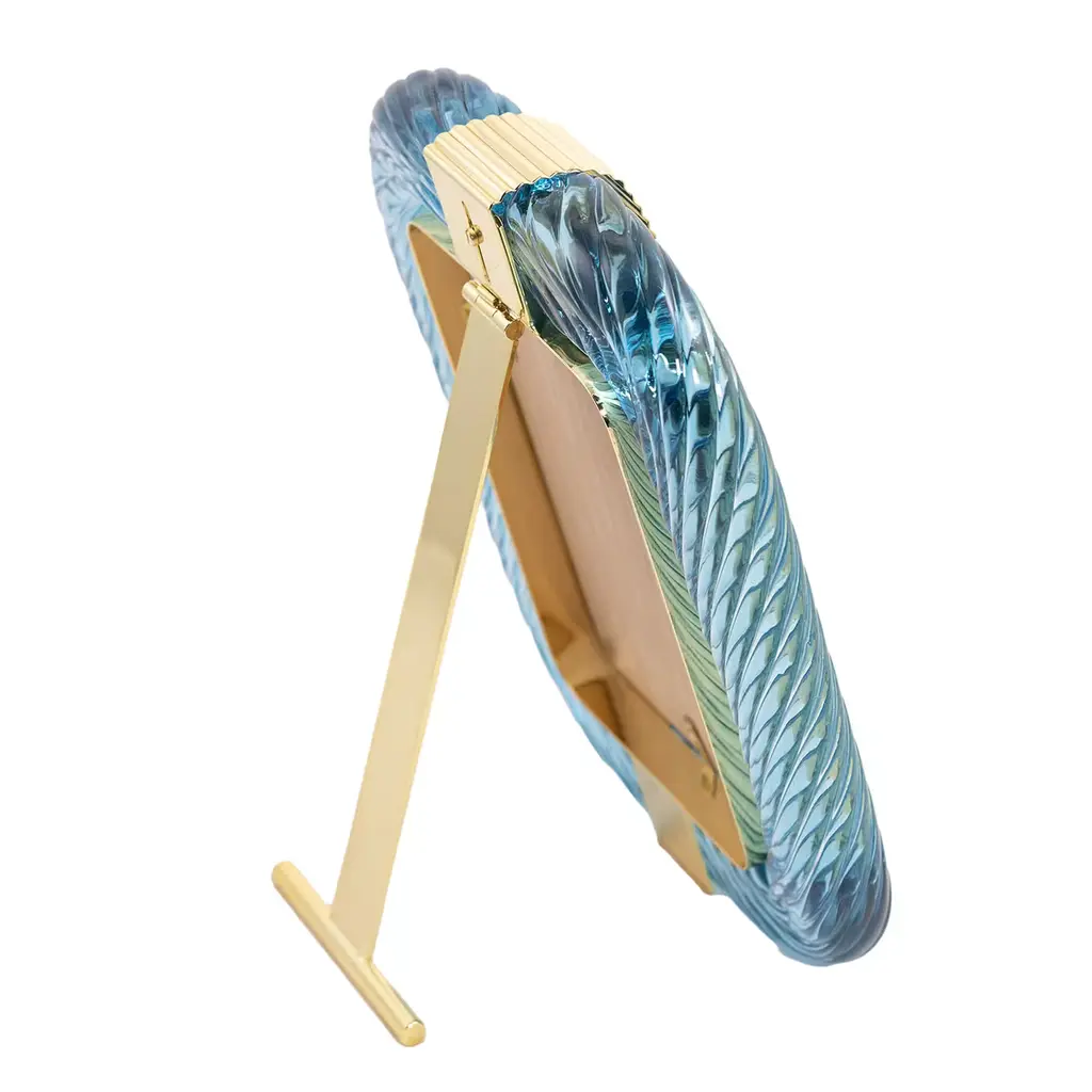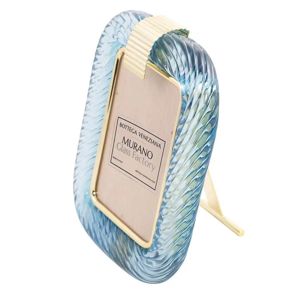 Handcrafted in a historic Venetian glassworks, this frame is created using the traditional blown glass twisting technique, resulting in a fluid, three-dimensional texture. The laguna light blue hue beautifully captures and reflects light, enhancing the craftsmanship.The hand-shaped brass structure is offered in a glossy finish and available on request in matte. Additional color variations are offered in the Artemest catalog. A smaller size is available upon request; please contact the Concierge for more information.