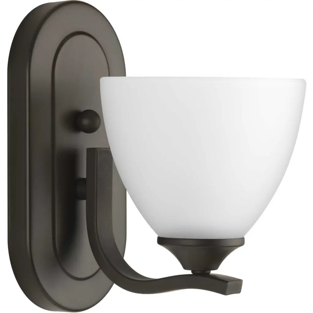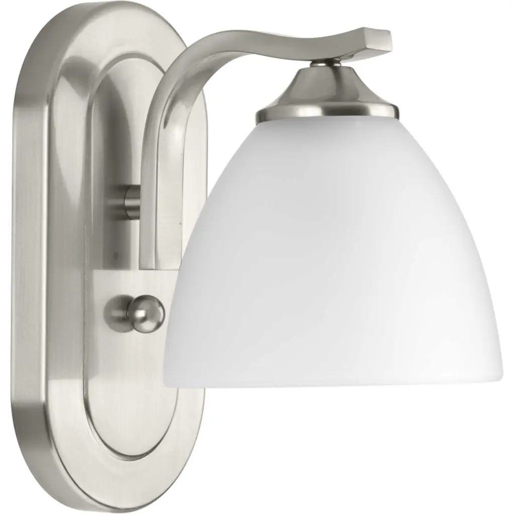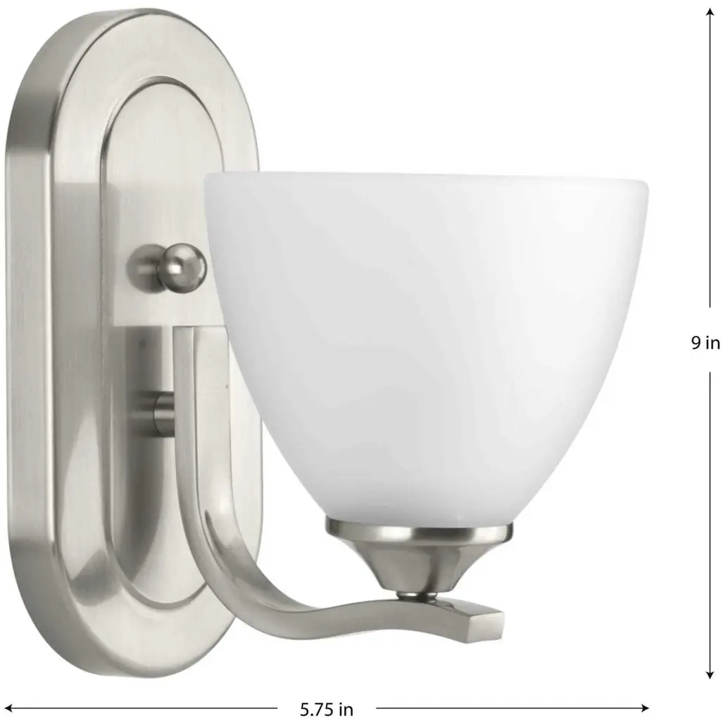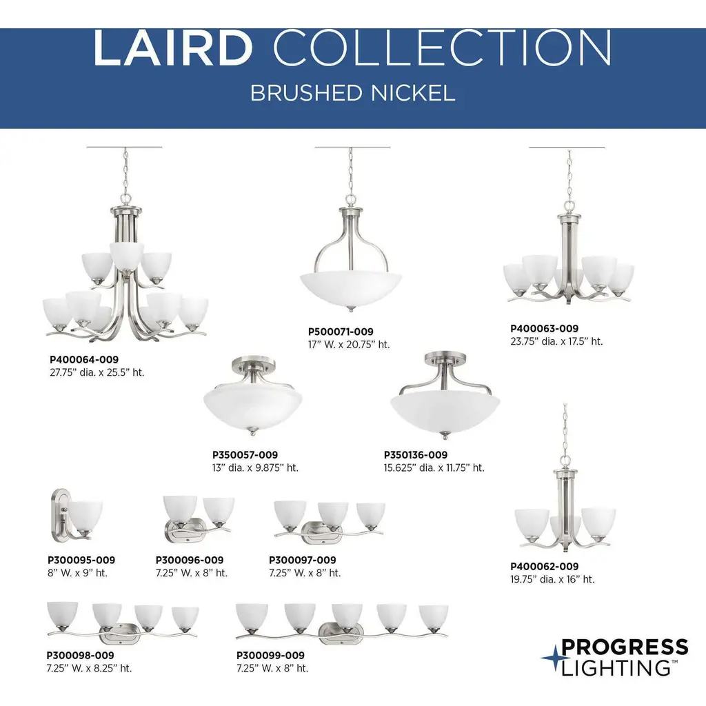 The Laird collection provides a contemporary complement to casual interiors popular in today's homes. Glass shades add distinction and provide pleasing illumination to any room, while scrolling arms create an airy effect. One-light bath & vanity in an Brushed Nickel finish.