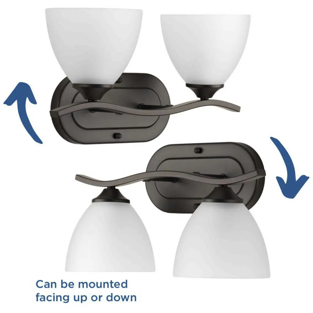 The Laird collection provides a contemporary complement to casual interiors popular in today's homes. Glass shades add distinction and provide pleasing illumination to any room, while scrolling arms create an airy effect. Two-light bath & vanity in an Antique Bronze finish.