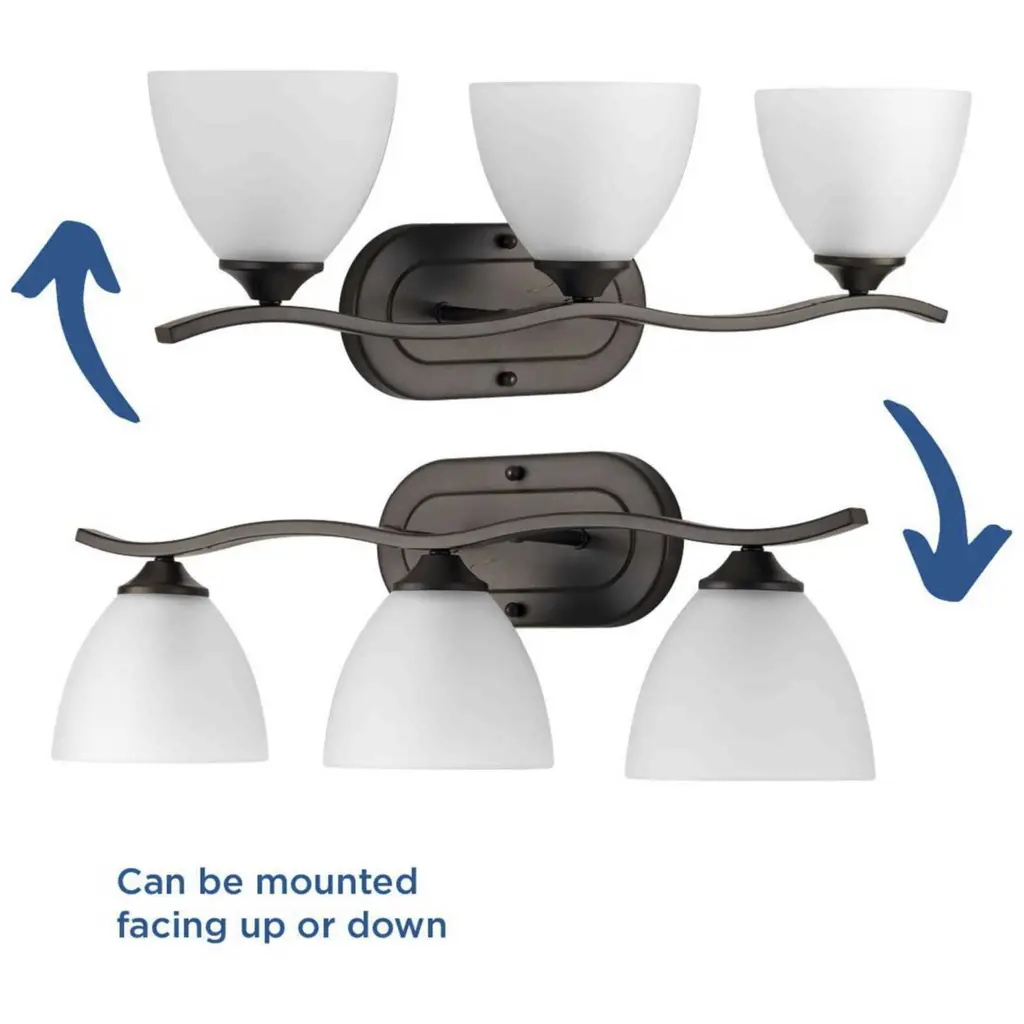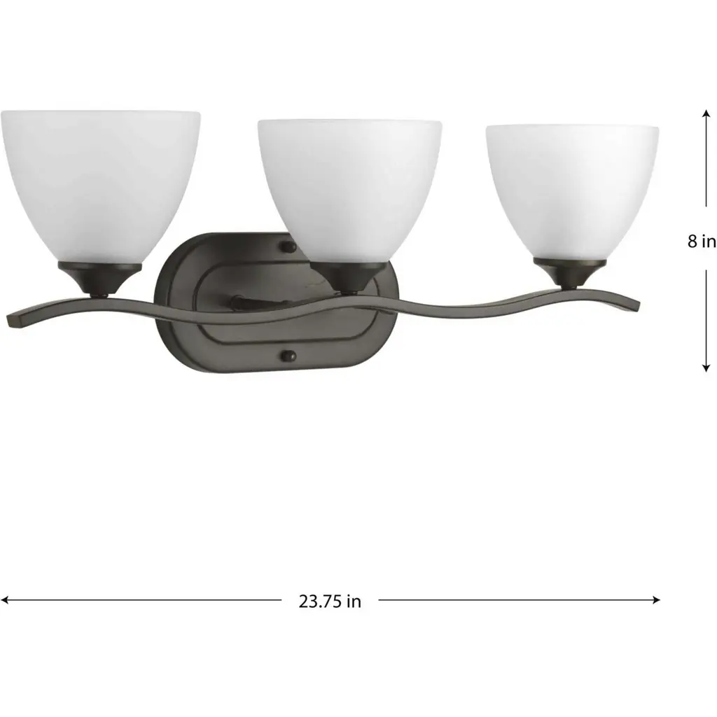 The Laird collection provides a contemporary complement to casual interiors popular in today's homes. Glass shades add distinction and provide pleasing illumination to any room, while scrolling arms create an airy effect. Three-light bath & vanity in an Antique Bronze finish.