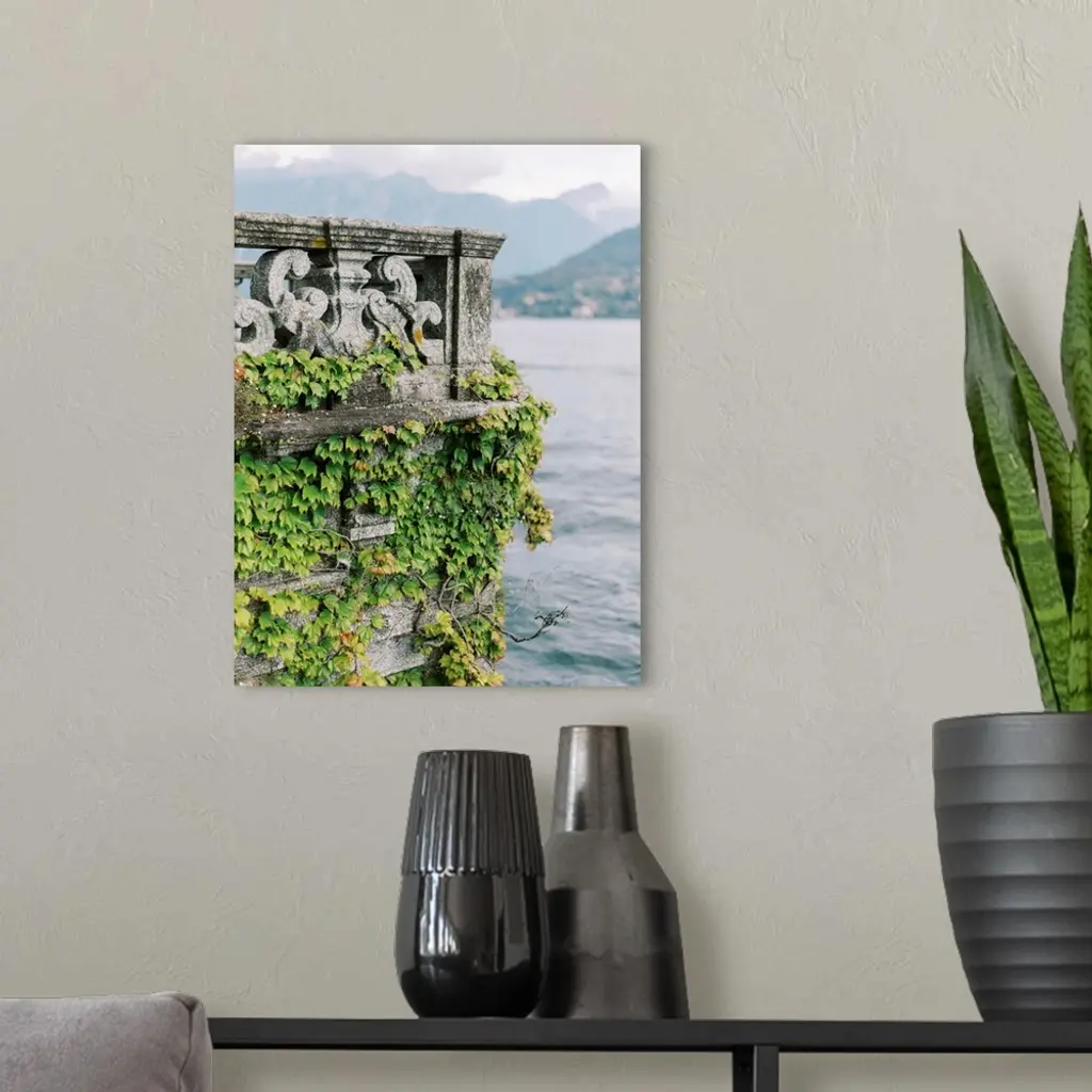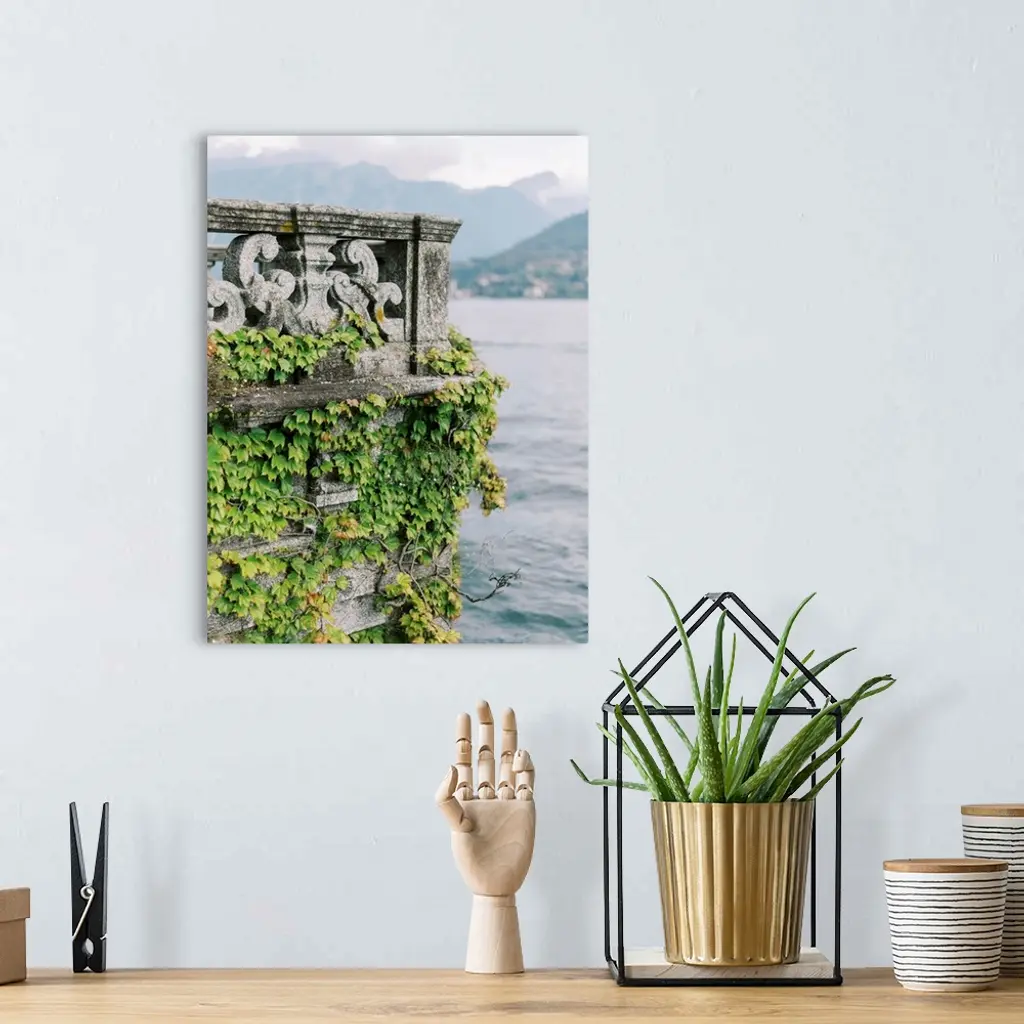 A photograph of an ornate stone balcony covered with ivy on the shore of Lake Como, Italy.