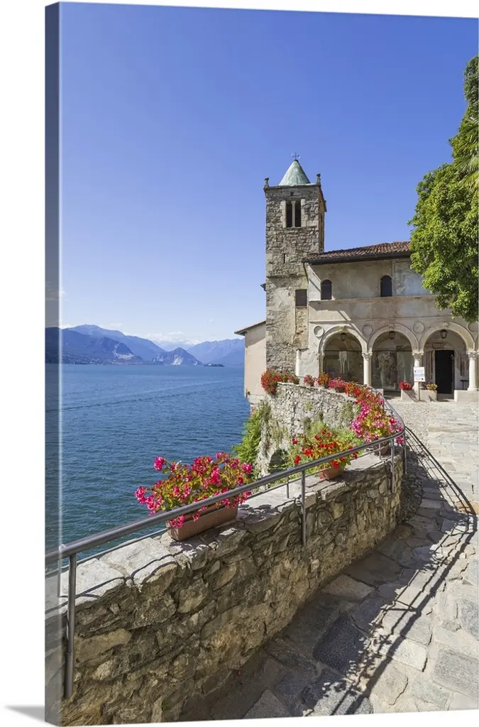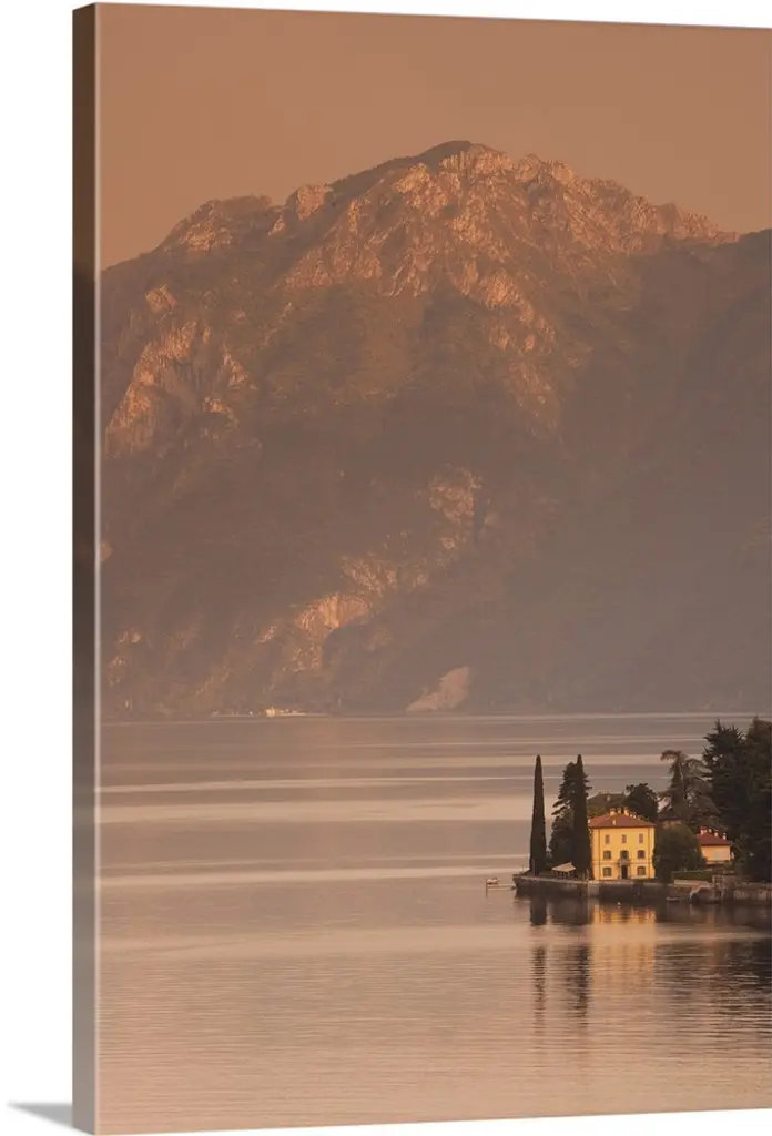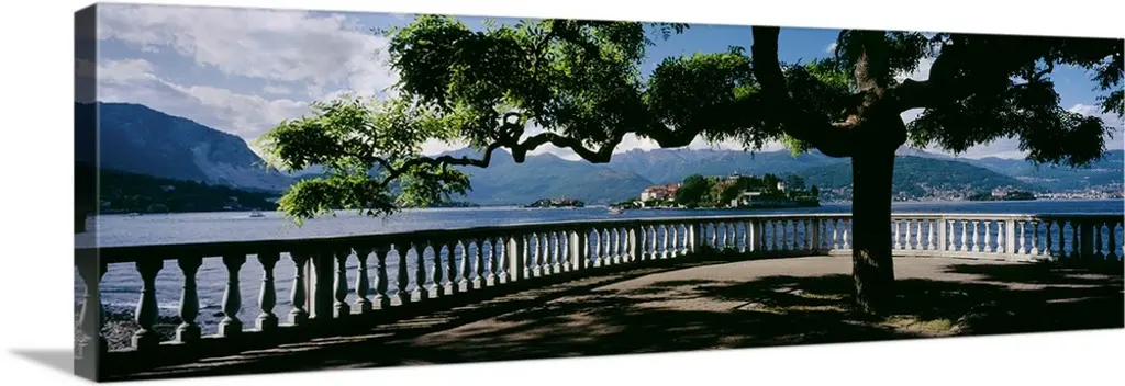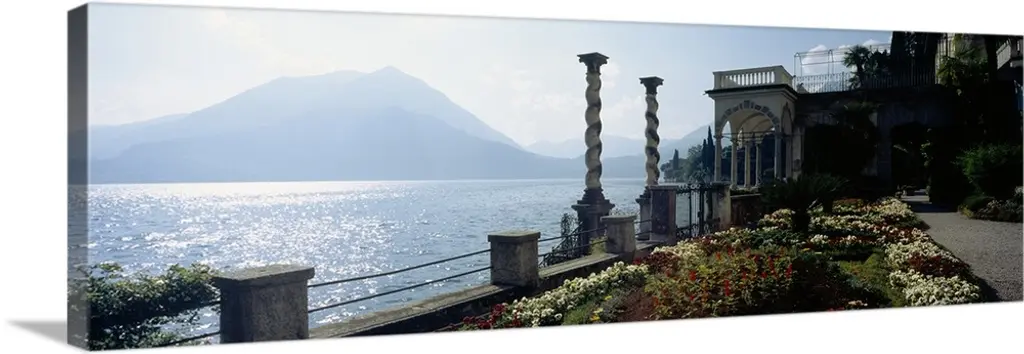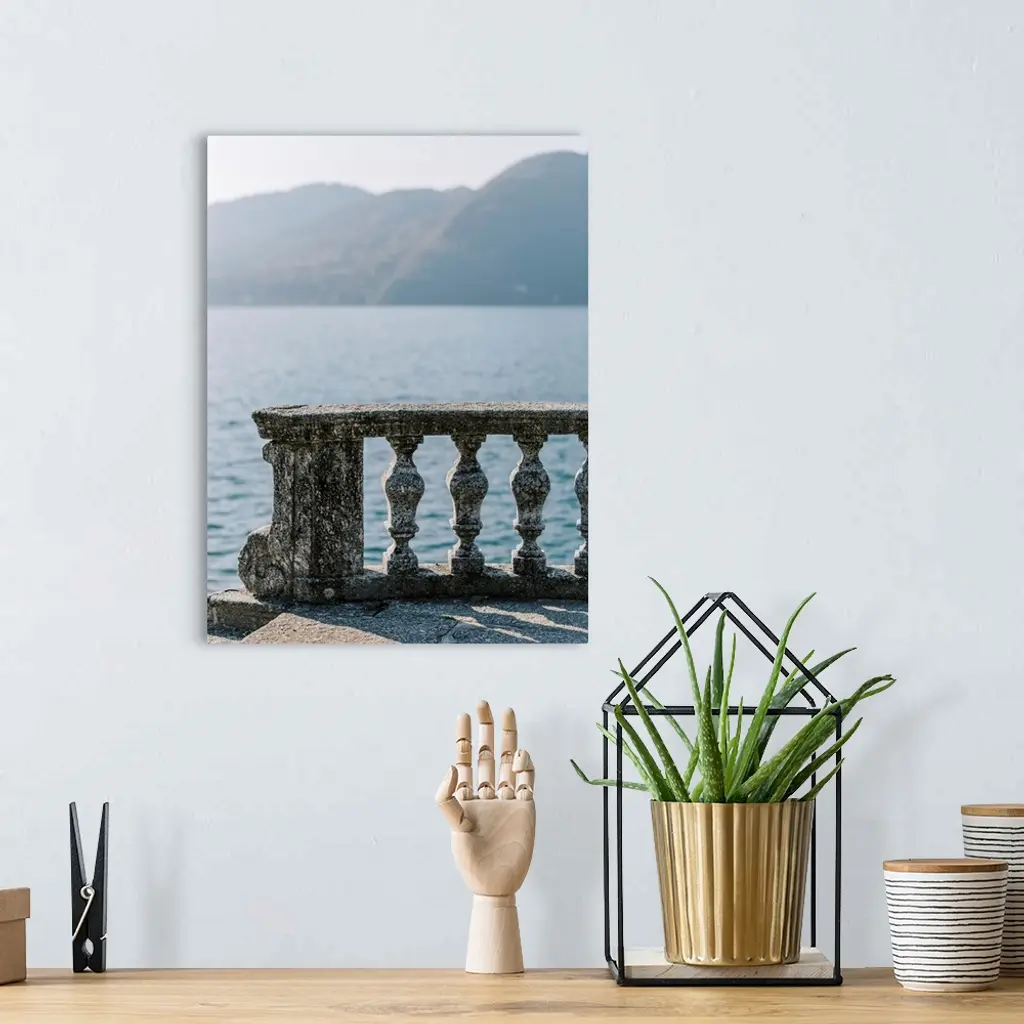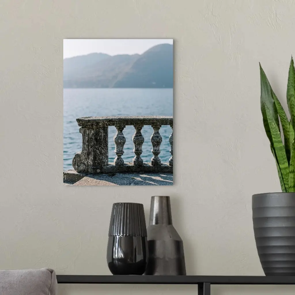 A photograph of an ornate stone balcony on the shore of Lake Como, Italy.