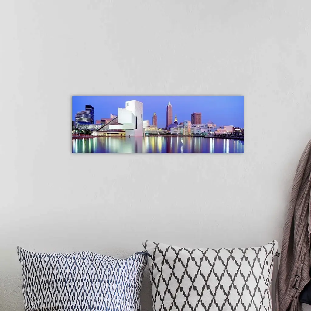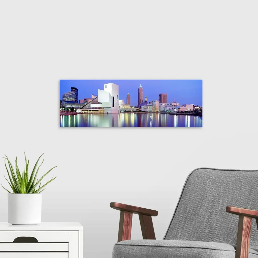 Large, panoramic photograph of the Cleveland skyline at dusk, reflecting in the waters of Lake Erie.
