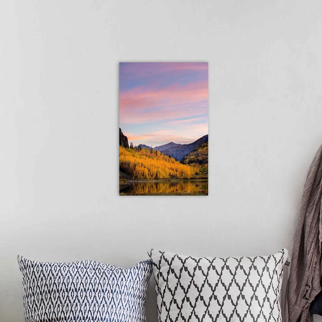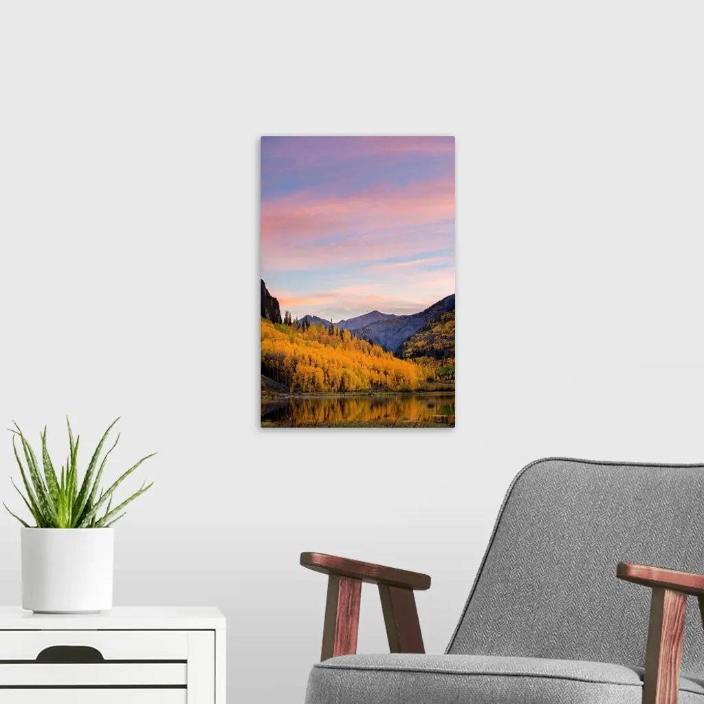 Landscape photograph of a lake lined with yellow Autumn trees and mountains in the background at sunset.