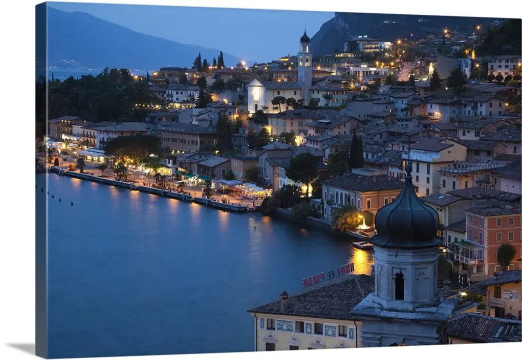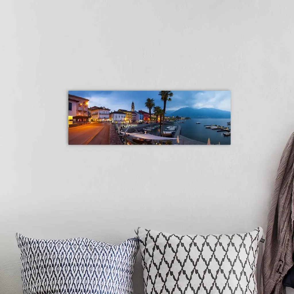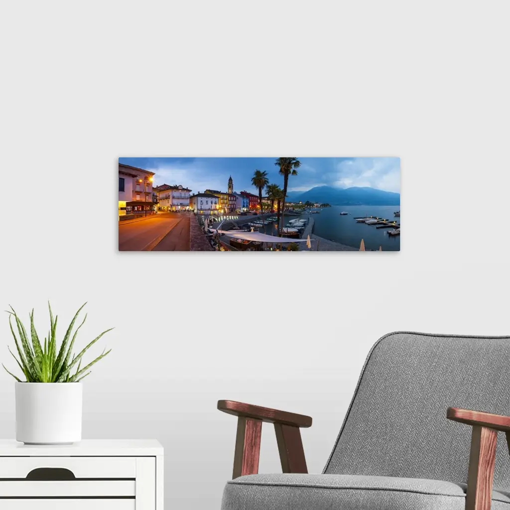 Ascona's picturesque Lakeside Promenade and Boat Harbour illuminated at Dusk, Ascona, Lake Maggiore, Canton of Ticino, Switzerland.