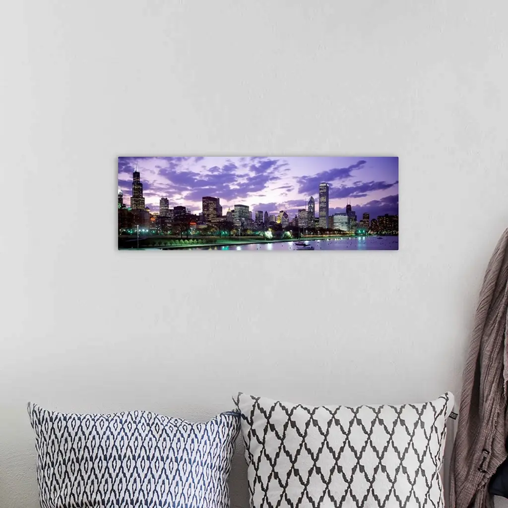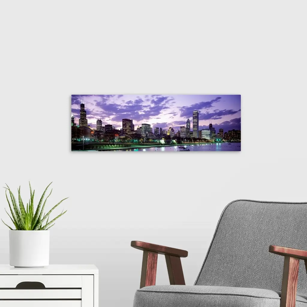 A panoramic photograph taken on Lake Michigan shows the busy skyline filled with skyscrapers in Chicago, Illinois while the sun starts to go down.