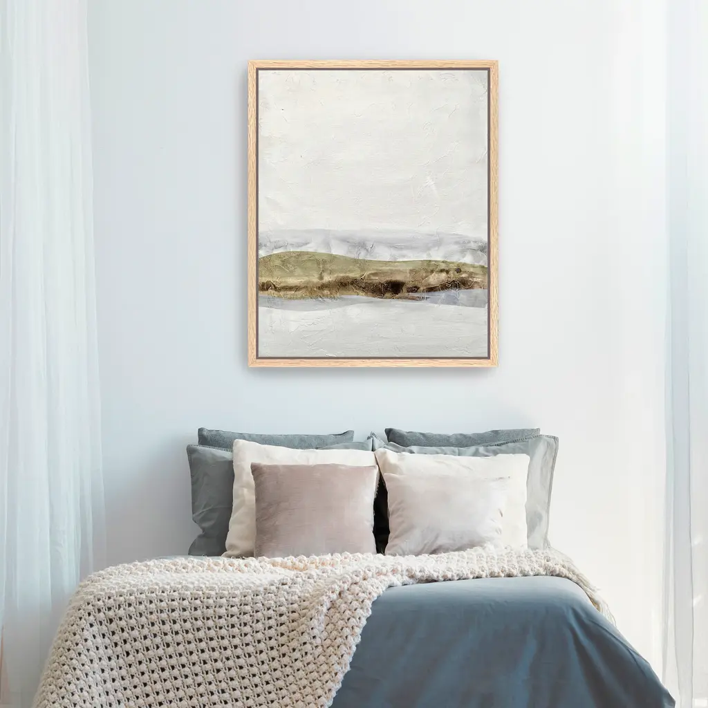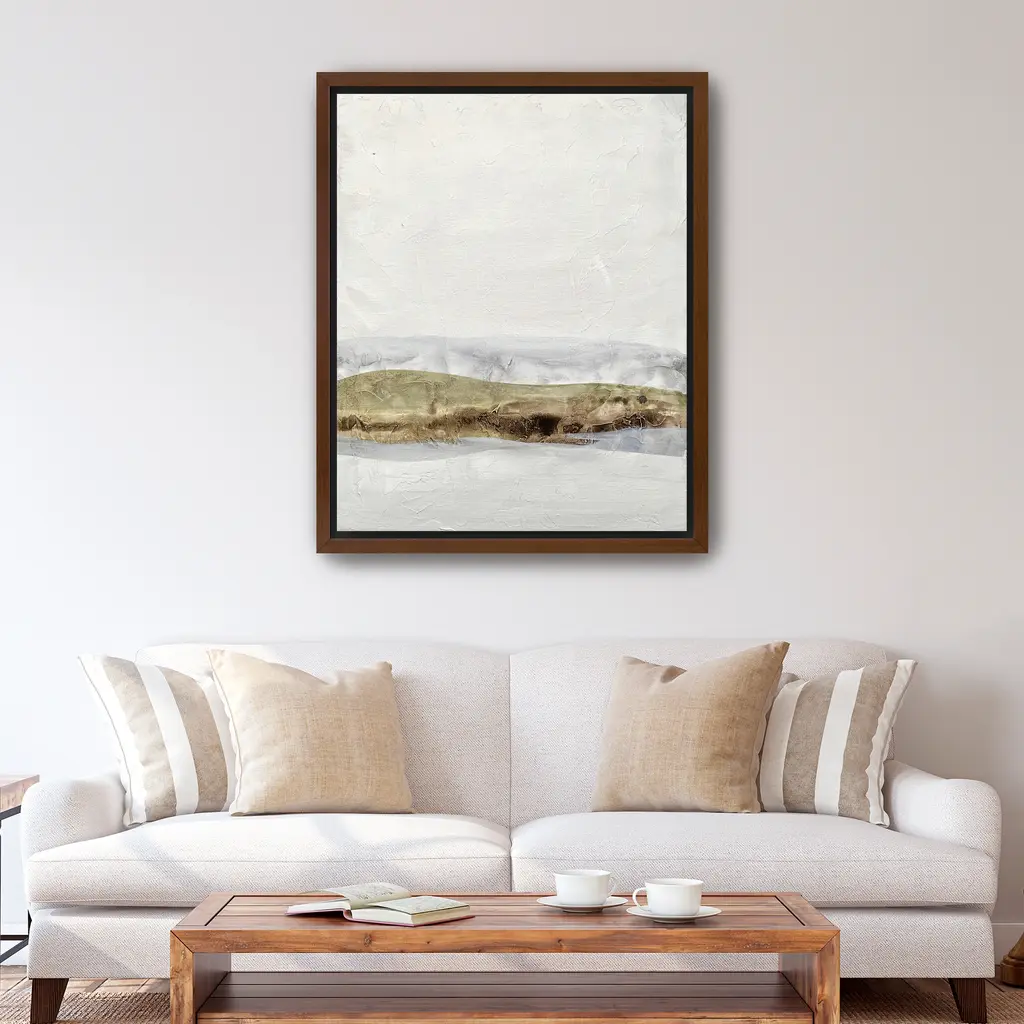 Add a touch of elegance to your home with the "Lake Morning" canvas art print by Haley Knighten. This piece features soothing neutral earthy tones that blend harmoniously, creating a serene and sophisticated atmosphere. Its abstract landscape design enhances both contemporary and classic interiors alike. Available in black frame, dark walnut frame, oak frame, or as a wrapped canvas. Our Gallery Wrap Canvas Prints are proudly assembled with high quality materials in California, USA. Each piece is printed on a thick, archival grade canvas using Giclee technology. It is then hand-stretched by our experienced artisans over solid wood bars, which will not warp over time. The final product is a piece personally crafted for you to confidently display on your wall. Care and Assembly: Ensure that the location of your piece has little to no exposure to heat, sunlight, and moisture. Wipe clean, only if needed. Each piece includes a sawtooth hanger to hang on your wall vertically.