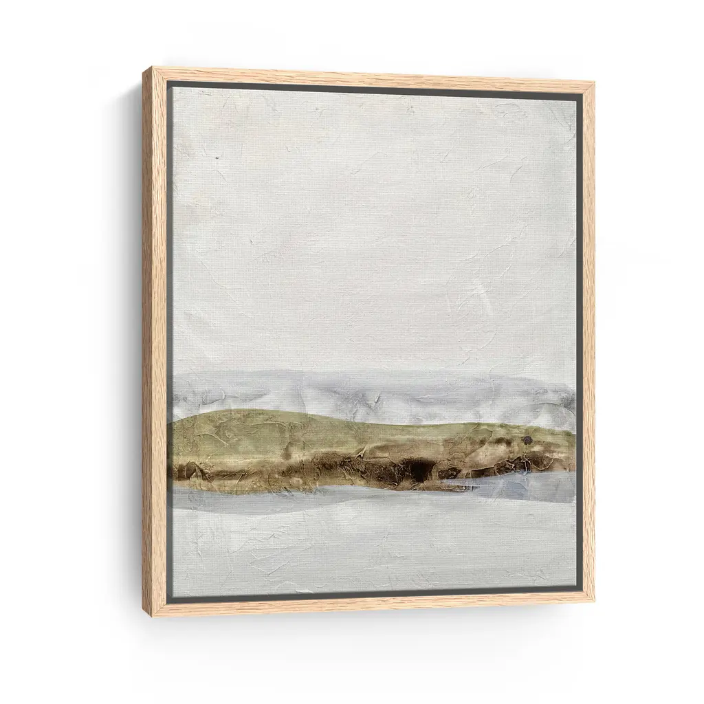 Add a touch of elegance to your home with the "Lake Morning" canvas art print by Haley Knighten. This piece features soothing neutral earthy tones that blend harmoniously, creating a serene and sophisticated atmosphere. Its abstract landscape design enhances both contemporary and classic interiors alike. Available in black frame, dark walnut frame, oak frame, or as a wrapped canvas. Our Gallery Wrap Canvas Prints are proudly assembled with high quality materials in California, USA. Each piece is printed on a thick, archival grade canvas using Giclee technology. It is then hand-stretched by our experienced artisans over solid wood bars, which will not warp over time. The final product is a piece personally crafted for you to confidently display on your wall. Care and Assembly: Ensure that the location of your piece has little to no exposure to heat, sunlight, and moisture. Wipe clean, only if needed. Each piece includes a sawtooth hanger to hang on your wall vertically.