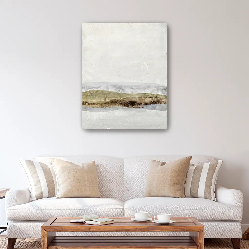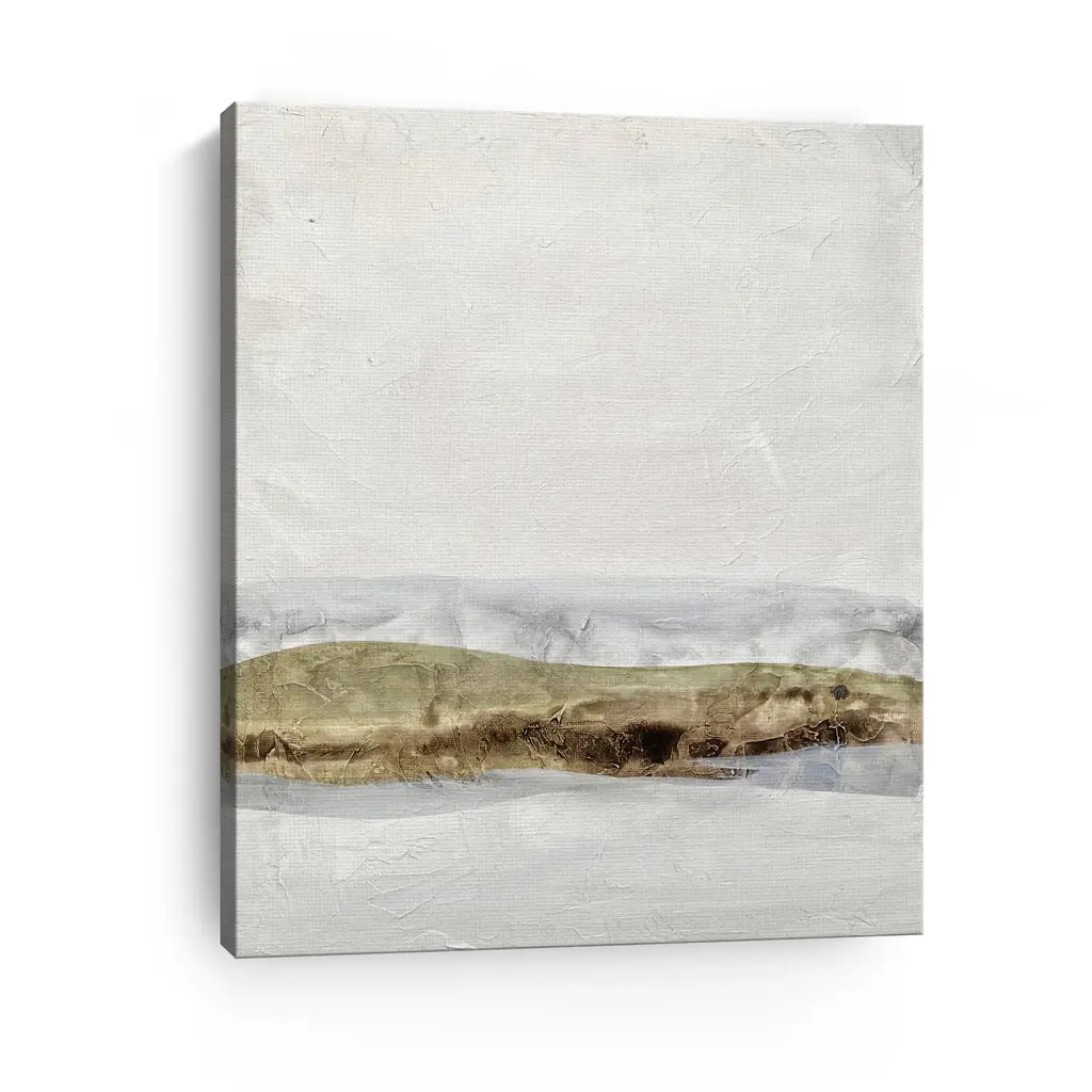 Add a touch of elegance to your home with the "Lake Morning" canvas art print by Haley Knighten. This piece features soothing neutral earthy tones that blend harmoniously, creating a serene and sophisticated atmosphere. Its abstract landscape design enhances both contemporary and classic interiors alike. Available in black frame, dark walnut frame, oak frame, or as a wrapped canvas. Our Gallery Wrap Canvas Prints are proudly assembled with high quality materials in California, USA. Each piece is printed on a thick, archival grade canvas using Giclee technology. It is then hand-stretched by our experienced artisans over solid wood bars, which will not warp over time. The final product is a piece personally crafted for you to confidently display on your wall. Care and Assembly: Ensure that the location of your piece has little to no exposure to heat, sunlight, and moisture. Wipe clean, only if needed. Each piece includes a sawtooth hanger to hang on your wall vertically.